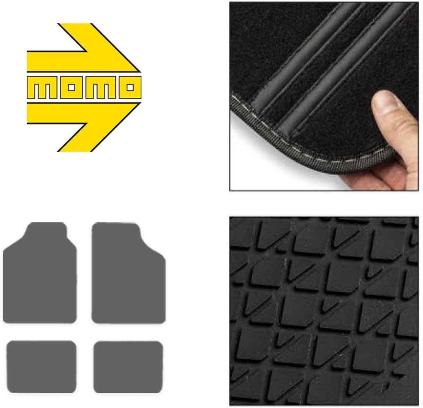 - DESIGN: Autofussmatten mit schlichtem Design in schwarzem Teppich und verstärktem Absatzpolster auf dem Fahrerteppich. Sie tragen das MOMO-Logo auf den vorderen Matten in Gelb, mit grauen Streifen und Nähten