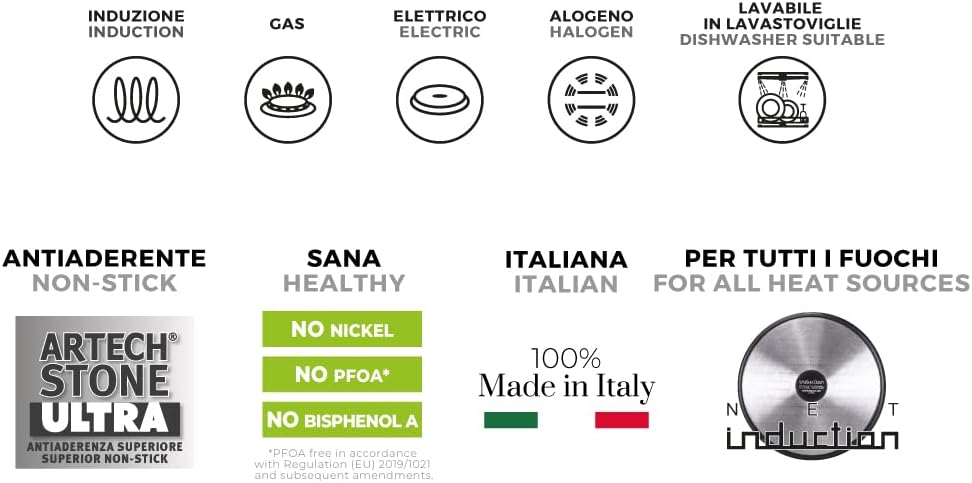 • Artech Stone Ultra Beschichtung in Steinoptik mit strukturierter Oberfläche für alle, die einen Topf suchen, der keine Angst vor harten Materialien hat. Ideal für schnelles, gleichmässiges und fettfreies Kochen. Extrem kratzfest und abriebfest. Frei
