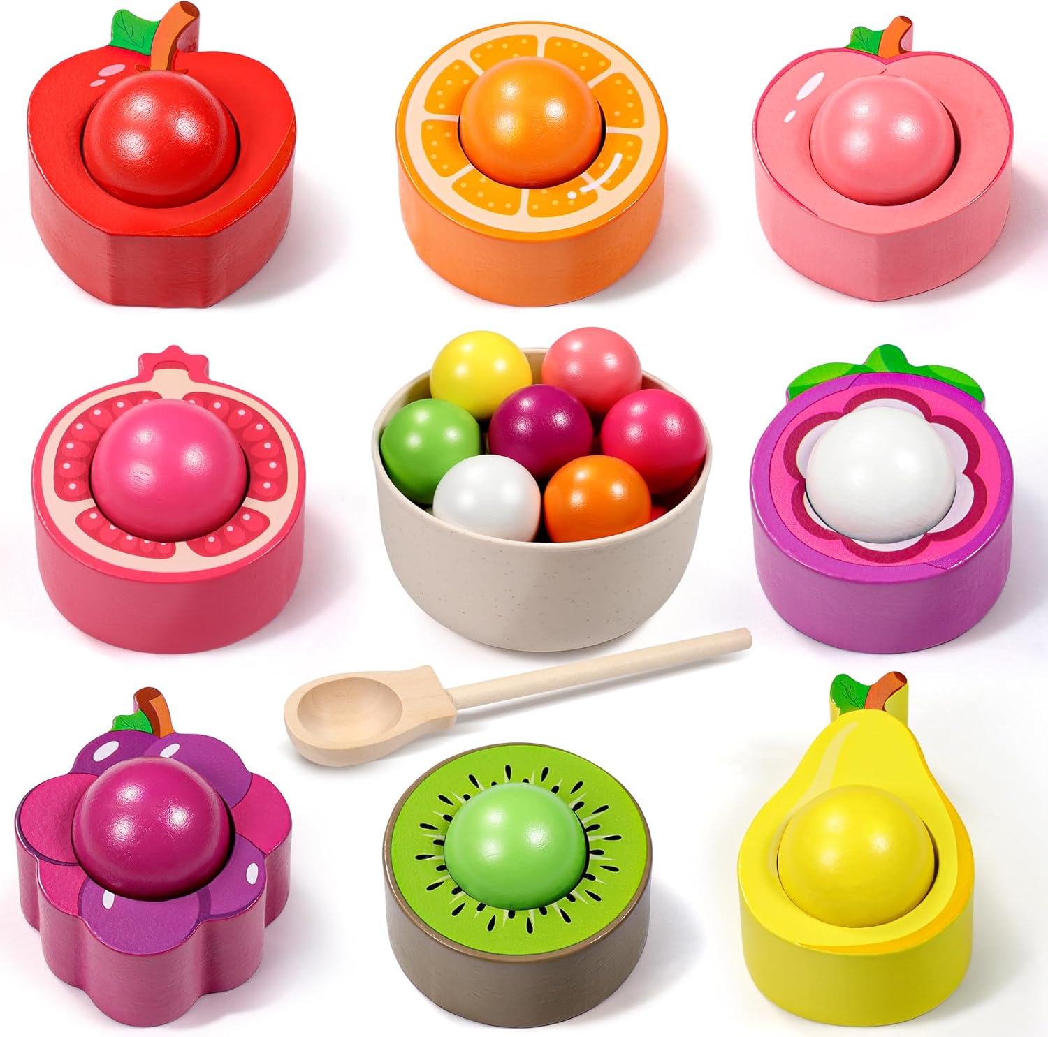 • Enthält: 8 Obstbecher, 8 bunte Holzkugeln, 1 Holzschale, 1 Löffel. Zu den Früchten zählen Kiwis, Pfirsiche, Birnen, Äpfel, Granatäpfel, Weintrauben, Orangen und Mangostanfrüchte. Bunte Früchte können die Spielbegeisterung der Kinder anregen.