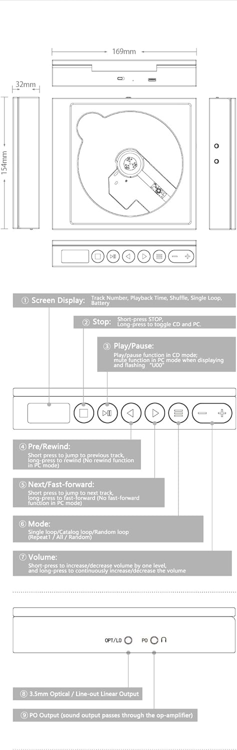 - Nicht nur ein tragbarer CD-Player, sondern auch eine USB-Desktop-Soundkarte. Es kann PCM-Dekodierung bis zu 32Bits/384kHz und DSD 256 unterstützen, wenn es als USB-Soundkarte verwendet wird.