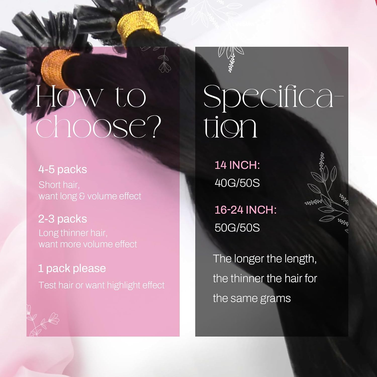 - Spezifikationen: Unsere 14 Zoll U Tip Haarverlängerungen wiegen 0,8 g/Strähne, wobei insgesamt 50 Strähnen 40 g wiegen. Für diejenigen, die längere Styles bevorzugen, bieten wir 16-24 Zoll lange, glatte U Tip Haarverlängerungen mit 1 g/Strähne an,