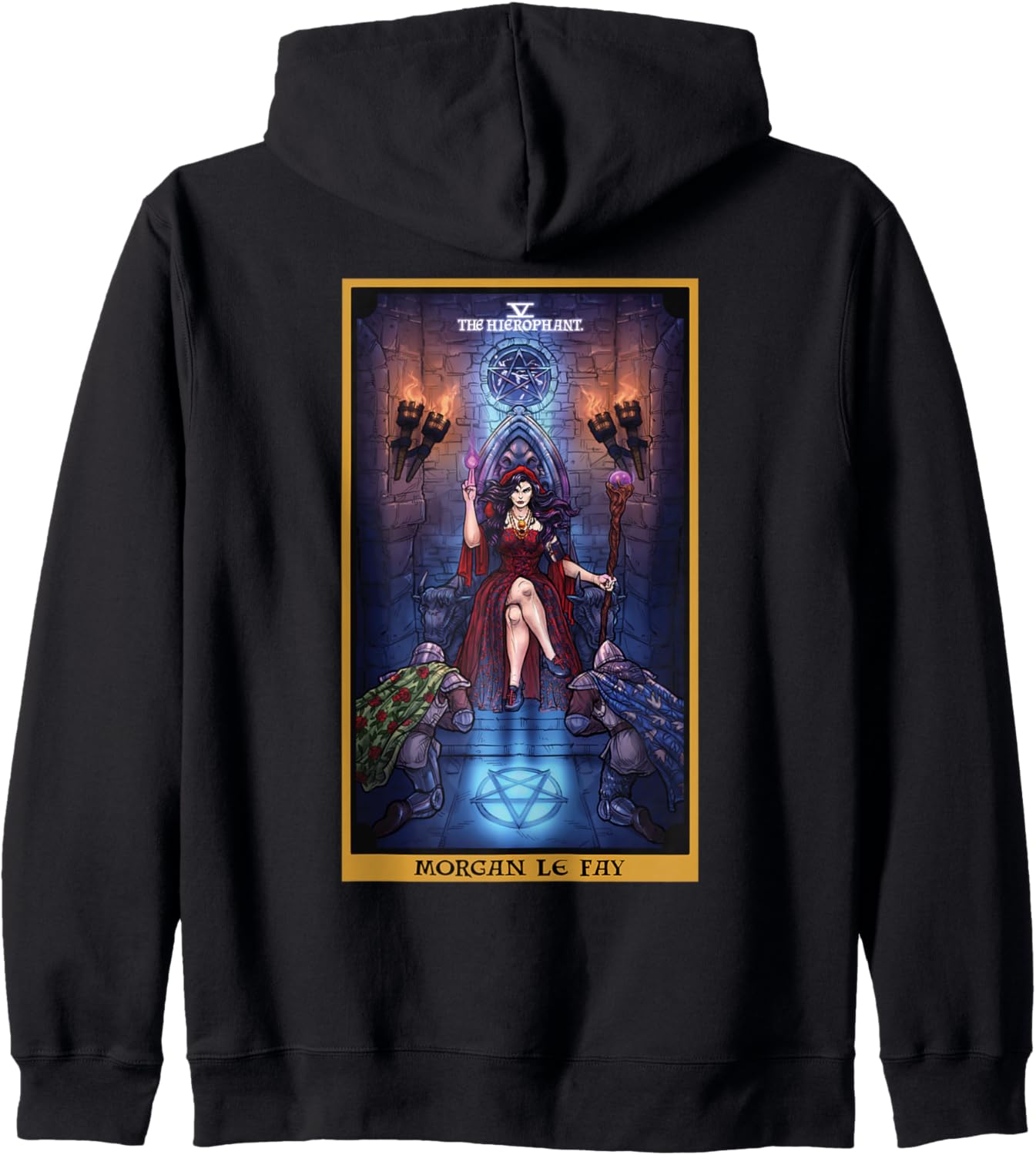 PRODUKTBESCHREIBUNGEN Morgan Le Fay steht in dieser Darstellung der Major Arcana Tarotkarte The Hierophant. Als Lehrling von Merlin, wird sie in den traditionellen Methoden der Hexerei und Zauberei gelernt. Die Pentagramme symbolisieren ihre Fähigkeit, helle und dunkle Magie zu verwenden. Obwohl sie manchmal als herausfordernd den Status Quo dargestellt hat, versucht sie ihren Bruder, König Arthur, vor denjenigen zu schützen, deren Absicht es ist, ihm zu schaden. Sie sitzt kraftvoll auf ihrem Thron und trägt einen magischen Stab, hebt zwei Finger und kanalisiert die obigen Kräfte.