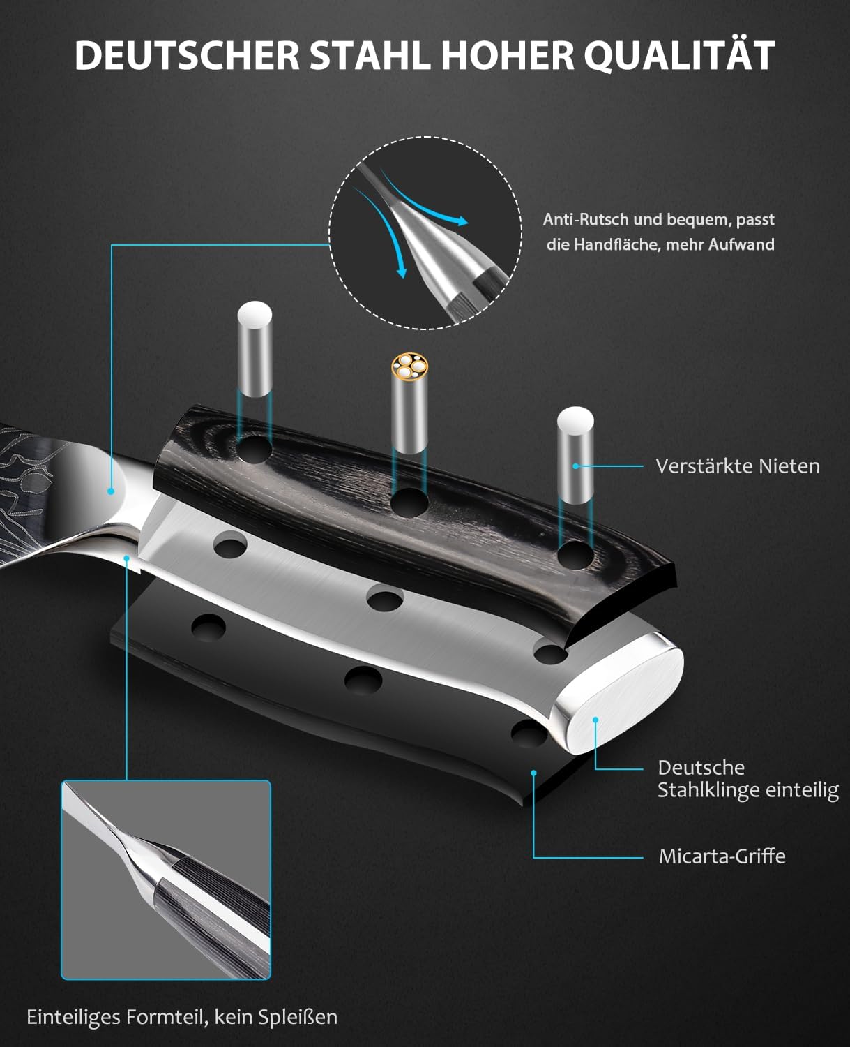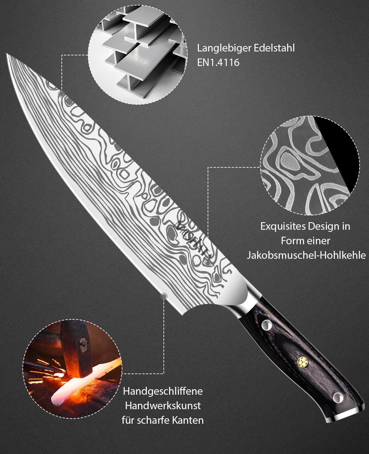 - 【Hochwertige Edelstahlklinge】Das professionelle küchenmesser aus hochwertigem Karbon Edelstahl und enthält 0,6-0,75% Kohlenstoff, 16-18% Chrom, 56-58 Rockwell-Härte, Es hat hoher Korrosionsbeständigkeit,hoher Härte,Verschleissfestigkeit. Nach langer Gebrauch beschlagen oder verblassen chefmesser nicht.