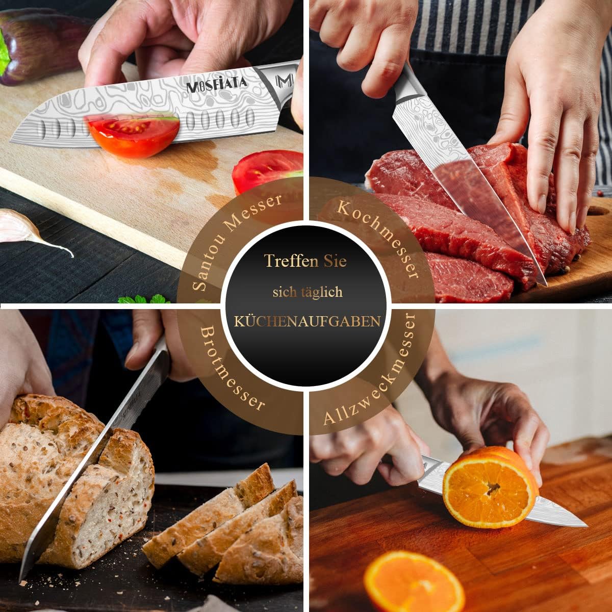 - 【Professionelles Küchenmesser-Set】 Kochmesser-Set umfasst ein 8-Zoll-Kochmesser, ein 8-Zoll-Brotmesser, ein 7-Zoll-Santoku Messer, ein 5-Zoll-Utility-Messer und ein 3,5-Zoll-Schälenmesser ,ein Fingerschutz und Lappen. Sehr geeignet zum Schälen,