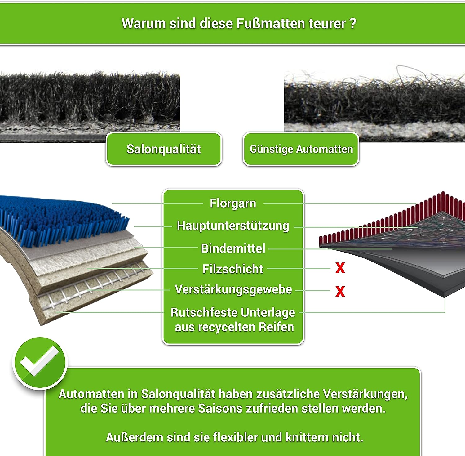 • ✅ [ SCHÜTZT IHT AUTO EFFEKTIV ] - Automatten in Salonqualität haben zusätzliche Verstärkungen (Verstärkungsgewebe und Filzschich) die Sie über mehrere Saisons zufrieden stellen werden. Ausserdem sind sie flexibler und knittern nicht. Dank der