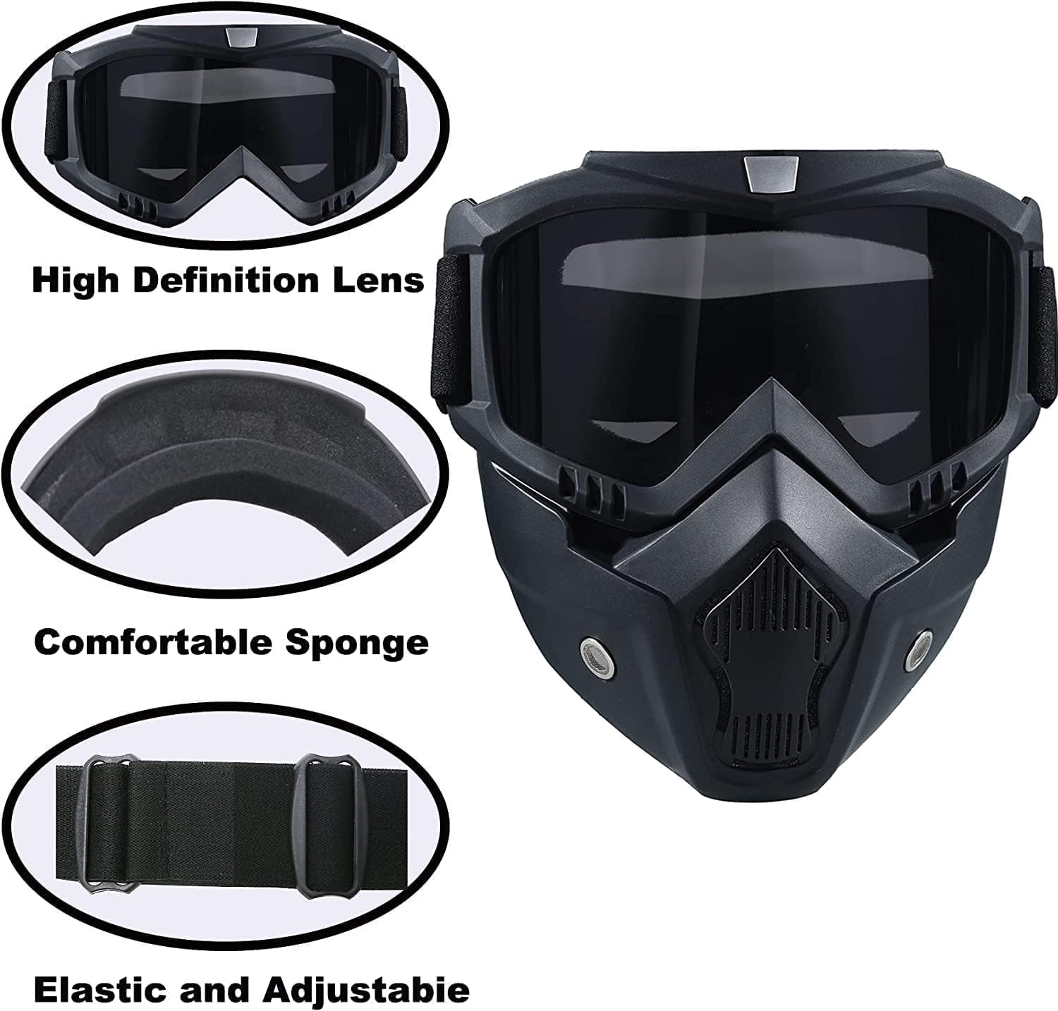 - Die Maske besteht aus thermoplastischem Polyurethan-Rahmen, Polycarbonat-Linse und Anti-UV-Beschichtung. Sie blockieren den kalten Wind weitgehend und verwenden Halbmasken, um zu verhindern, dass Sand/Regen beim Fahren in Mund und Augen eindringt.