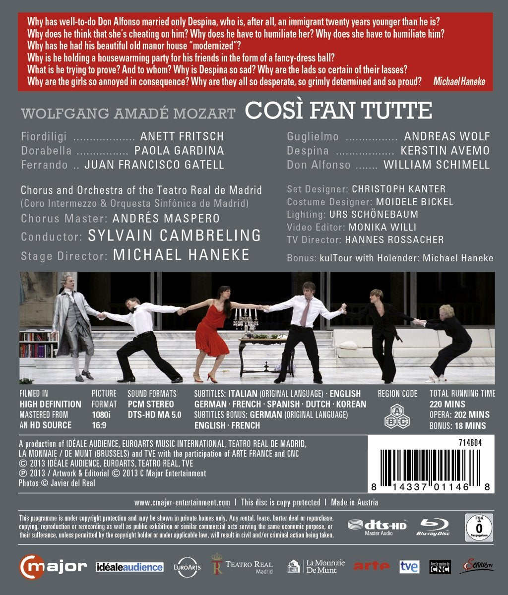 PRODUKTBESCHREIBUNGEN KURZBESCHREIBUNG "Musik" Chorus and Orchestra of the Teatro Real de Madrid (Coro Intermezzo & Orquesta Sinfónica de Madrid) Chorus Master: Andrés Maspero Conductor: Sylvain Cambreling "Interpreten" Guglielmo - Andreas Wolf Despina - Kerstin Avemo Don Alfonso - William Schimell REZENSION ..., so macht es nur einer, ein Grosser. --Die Welt Vor allem die sechs fabelhaften,teilweise blutjungen, aus 120 internationalen Bewerbern gecasteten Sängersolisten … --Die Zeit Haneke hat sich ein hervorragendes Ensemble vor allem jüngerer Sänger auf die Bühne geholt, die vom französischen Dirigenten Sylvain Cambreling souverän begleitet werden. … herausragenden Sopranistin Anett Fritsch… --Tagesspiegel Mehr