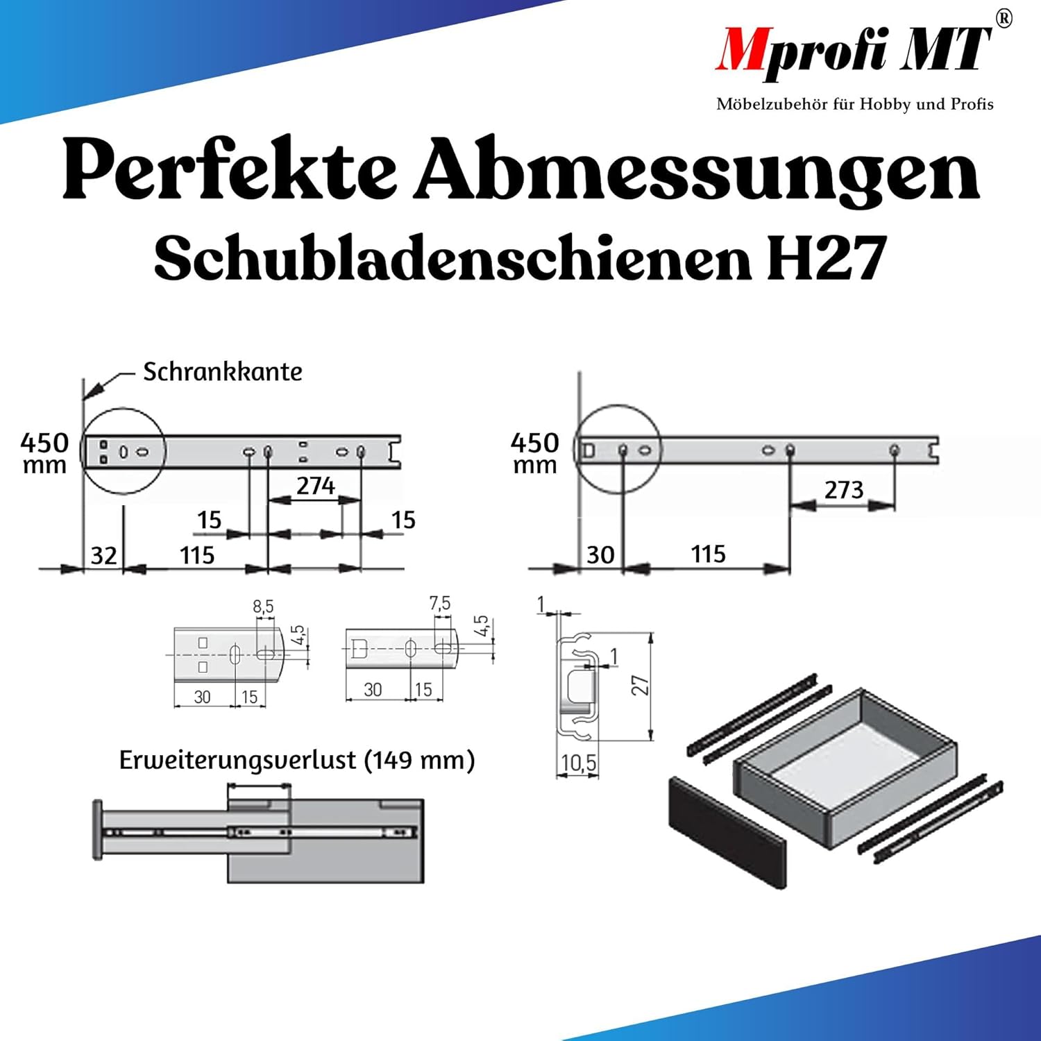 - Teilauszug Design – Diese Schubladenschienen sind als Teilauszug konstruiert, was eine einfache Zugänglichkeit bei begrenztem Platz ermöglicht und sich ideal für kompakte Möbelprojekte eignet. Die Auszugsschienen haben eine eingefahrene Länge von