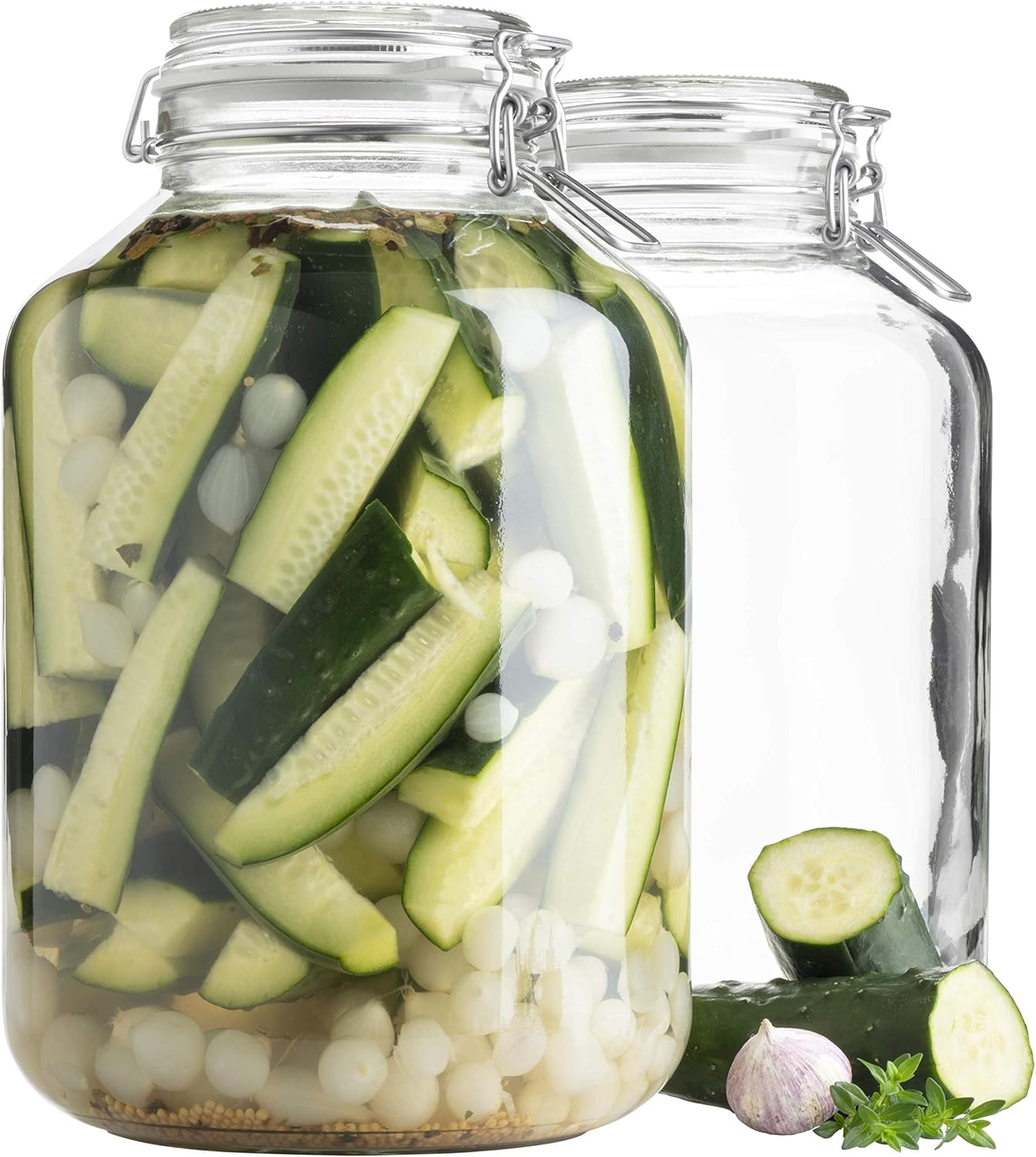- Set aus 2 x grosses Einmachglas bzw. Gurkenglas à 4,8 Füllvolumen. Dickwandiges Glas, stabiler und verzinkter Bügelverschluss, weisser Dichtring aus Kautschuk ohne Weichmacher