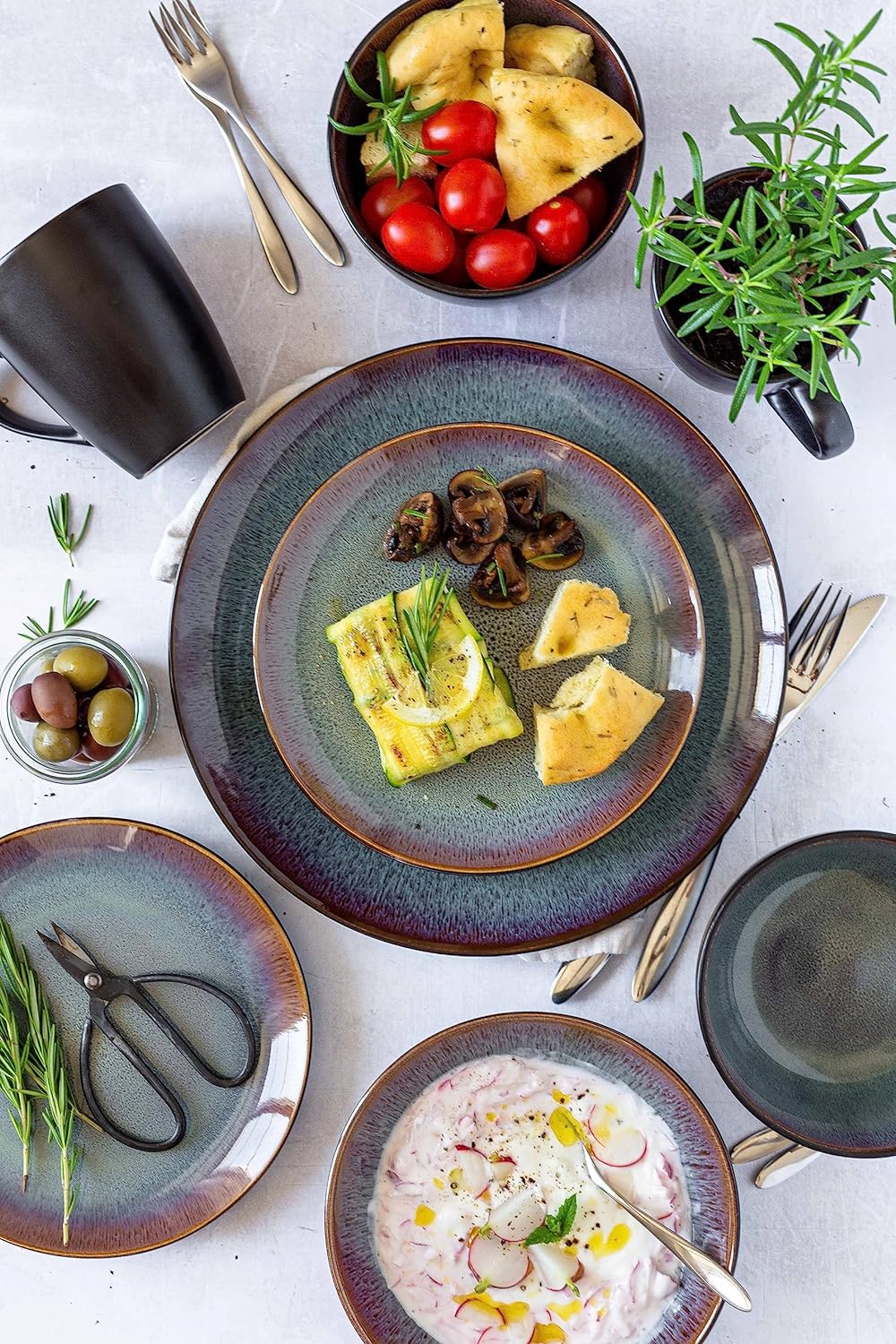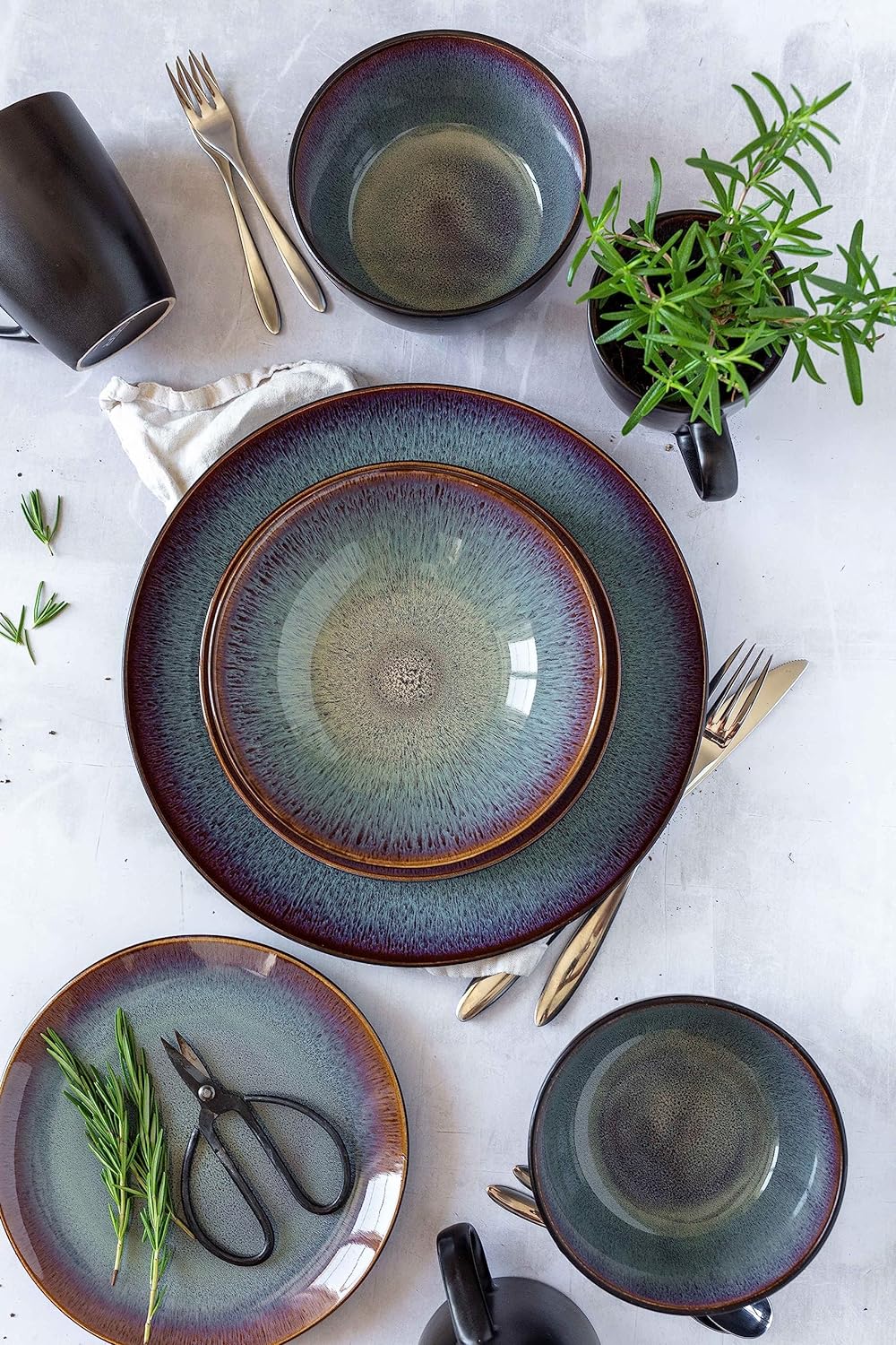 - Aufregend glasiertes Tellerset für 4 Personen aus Steinzeug mit einer besonderen Kombination aus Reaktivglasur und mattschwarzer Aussenglasur, Ø 17,8 cm