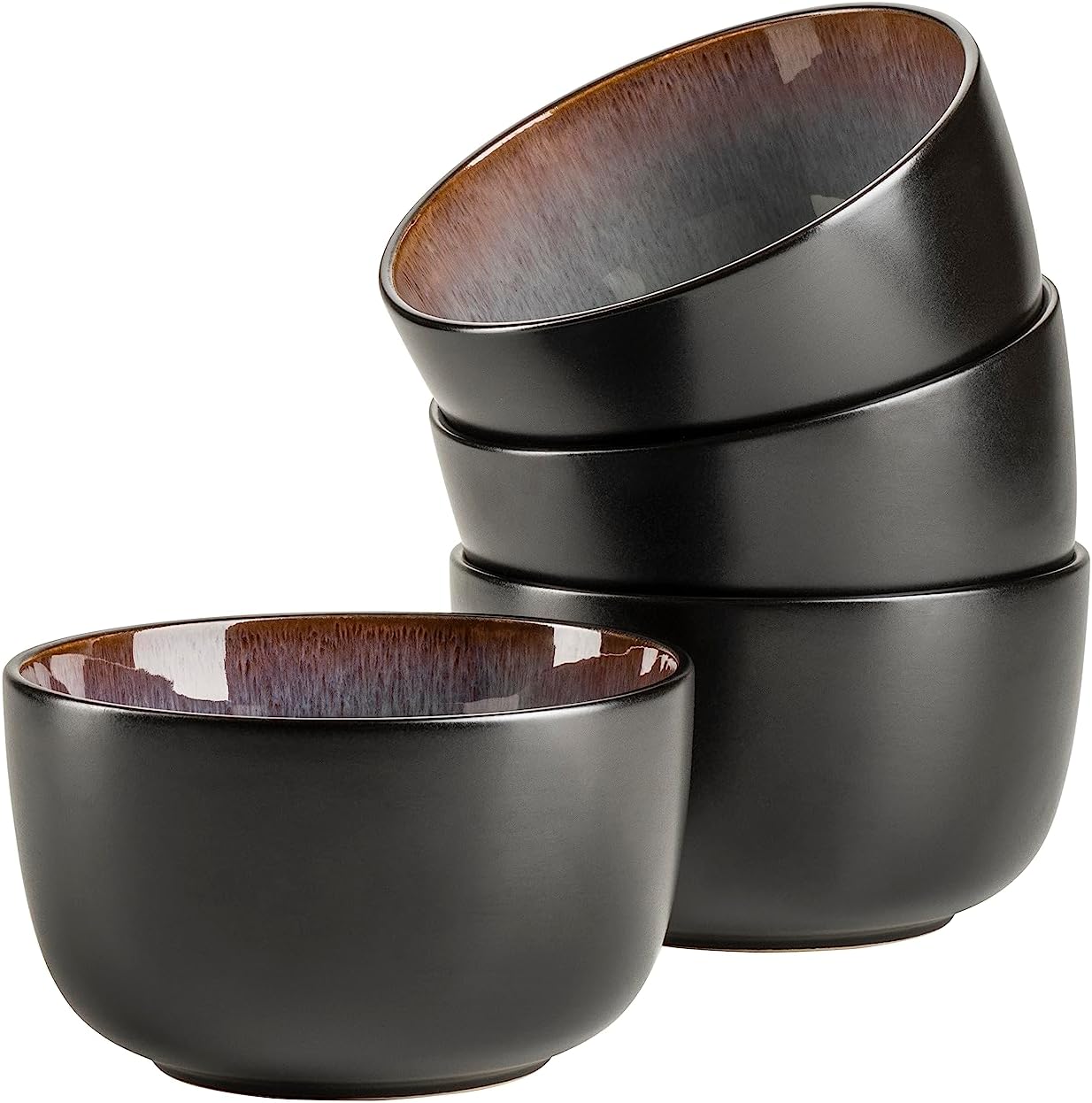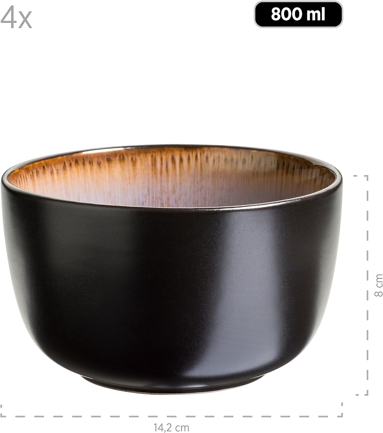 - Aufregend glasierte Müslischüsseln im 4er Set aus pflegeleichtem Steinzeug mit einer besonderen Kombination aus Reaktivglasur und mattschwarzer Aussenglasur, Ø 14,2 cm und 500 ml Volumen
