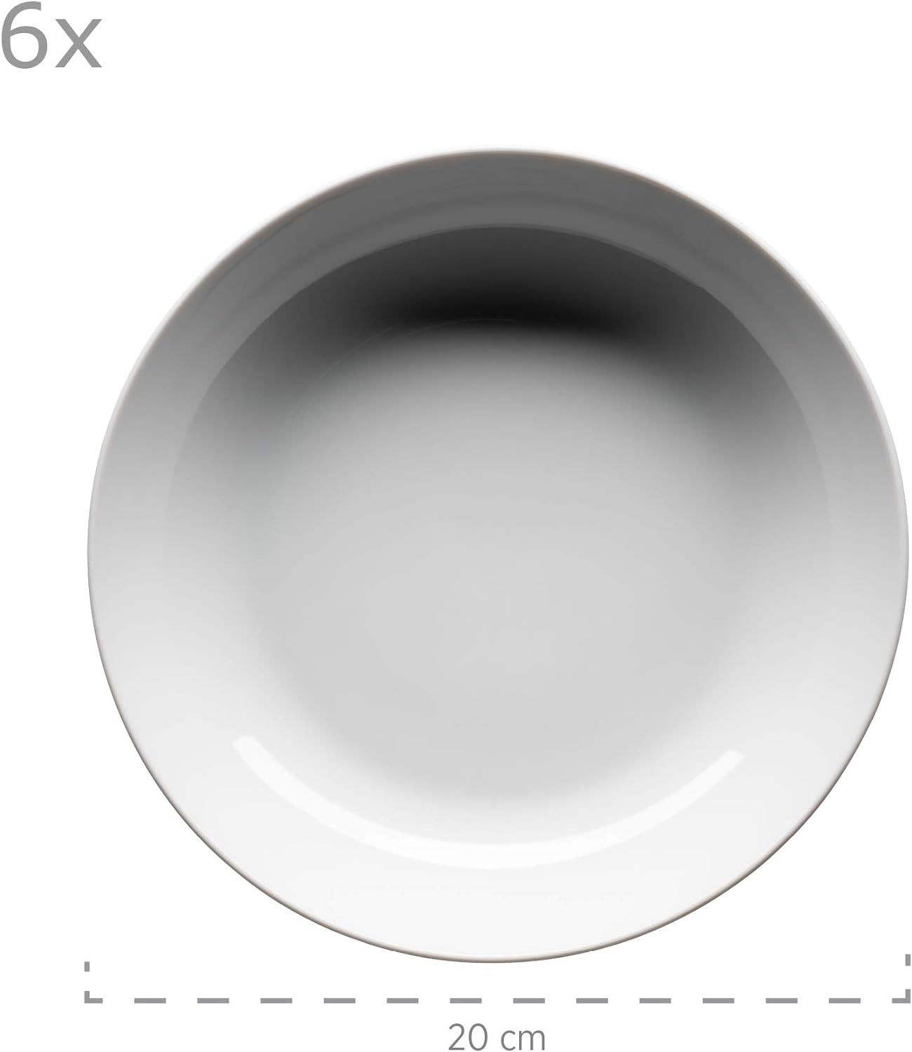 - Dieses 30-teilige Service Set für 6 Personen aus Porzellan in Weiss besteht aus 6x Essteller flach (Ø 24 cm), 6x Suppenteller tief (Ø 20 cm), 6x Dessertteller bzw. Frühstückteller (Ø 20,5 cm), 6x Kaffeetasse (230 ml Füllmenge) und 6x