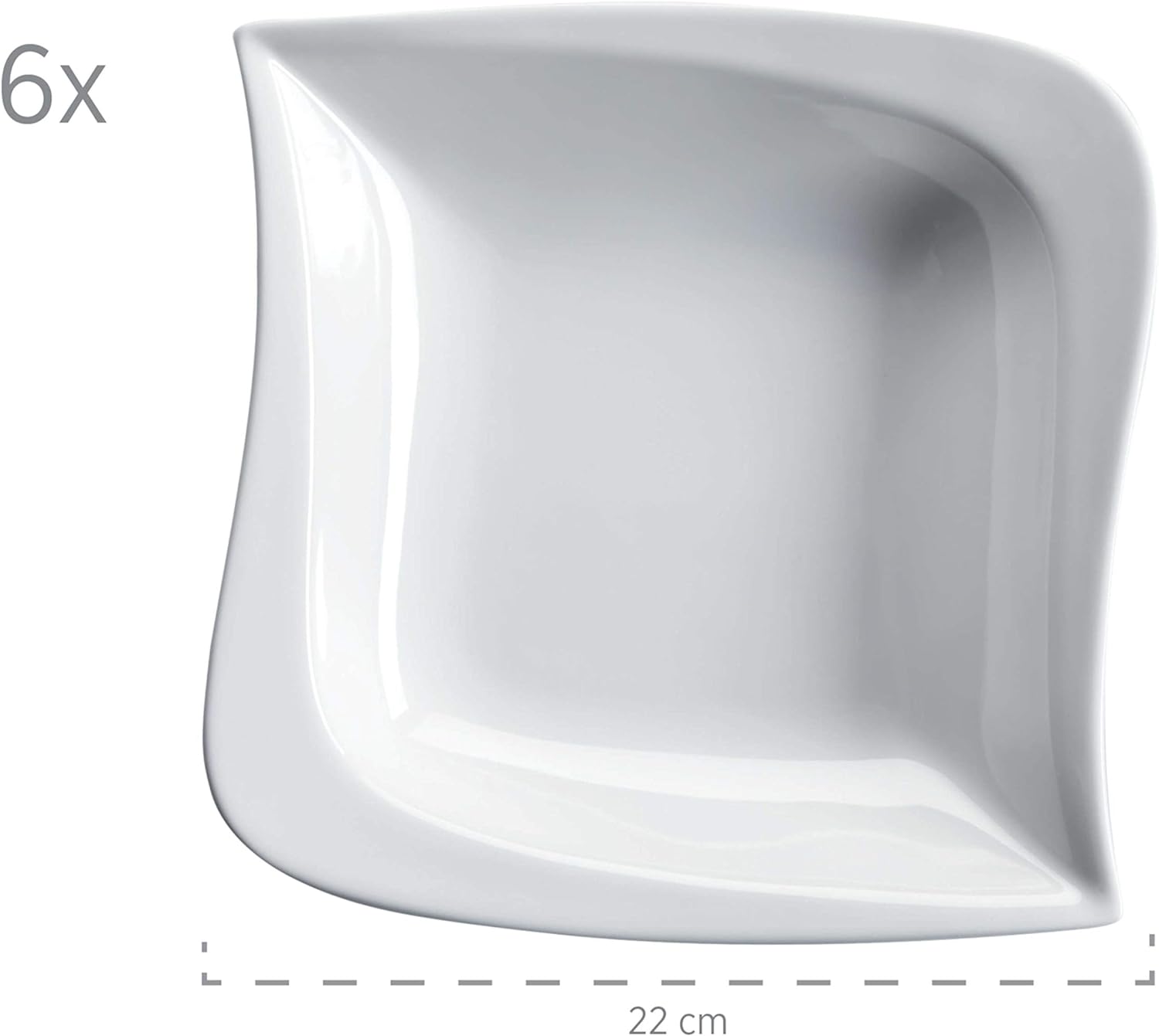 • Kombiservice bestehend aus 6 Kaffeeobere à 235 Milliliter, 6 Kaffeeuntere à 13,6 Zentimeter, 6 Dessertteller à 21,5 Zentimeter, 6 Teller tief à 22 Zentimeter, und 6 Teller flach à 25,5 Zentimeter.