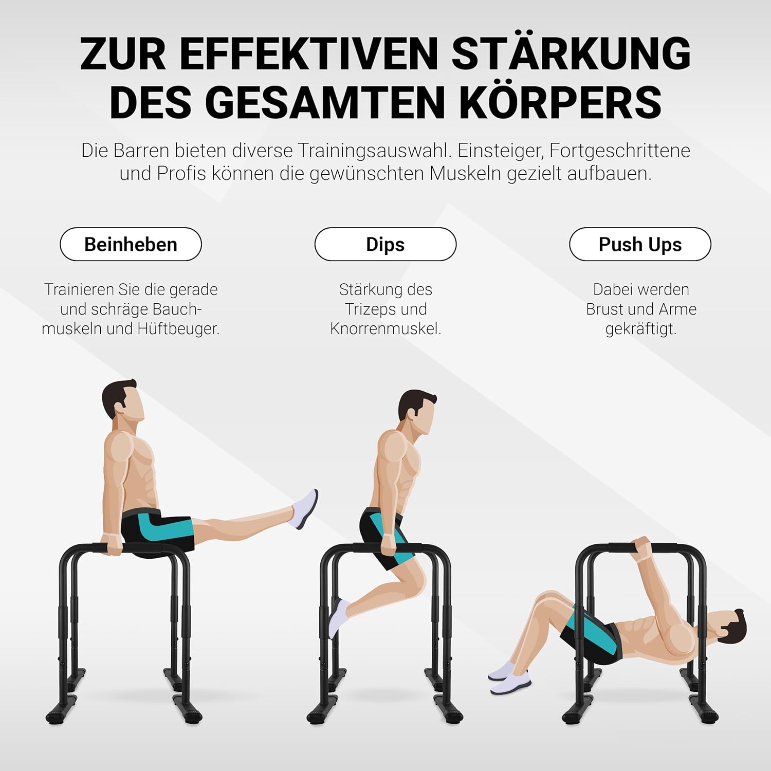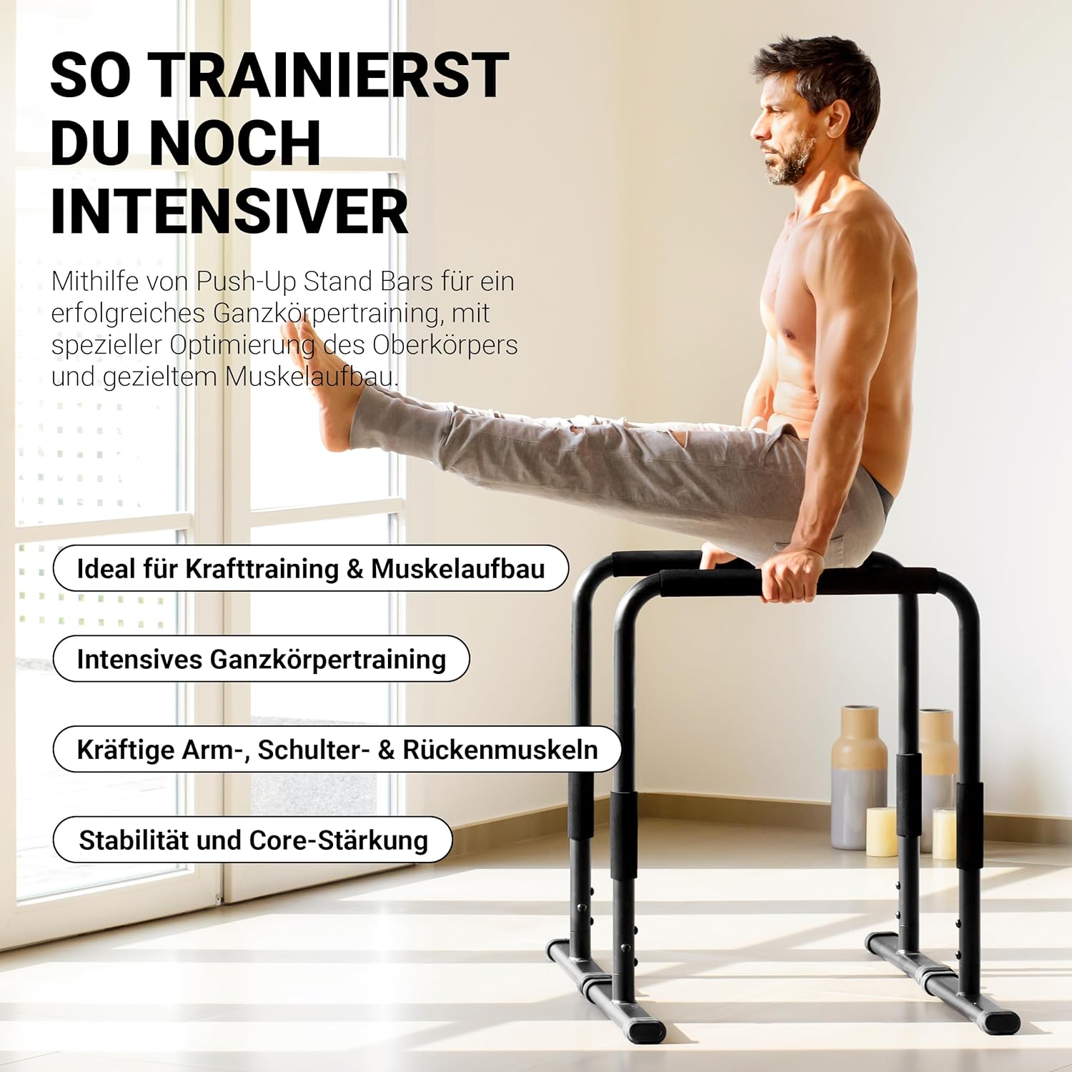 - TRAININGSEFFEKT – Nicht nur die Arme, die Brust und der vordere Deltamuskulatur können mit den Push Up Bars trainiert werden. Auch um die Ellenbogen-, Handstrecker-, Bauch- und Beinmuskulatur effektiv aufzubauen ist die Dip Station der perfekte