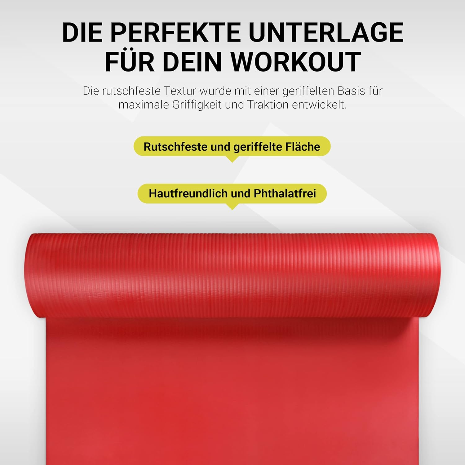 • PREMIUM-QUALITÄT – Die Gymnastikmatte mit strapazierfähiger Beschaffenheit wird durch angenehmem und RUTSCHFESTEM SYNTHESEKAUTSCHUK (NBR) – Material hergestellt. Der HOCHWERTIGE und UMWELTFREUNDLICHE Kautschuk enthält keine Weichmacher und ist somit – Physiologisch unbedenklich, hygienisch einwandfrei, geruchlos, HAUTFREUNDLICH und ROBUST. Unsere Fitnessmatten sind von dem unabhängigen und renommierten Institut SGS geprüft und verifiziert worden.