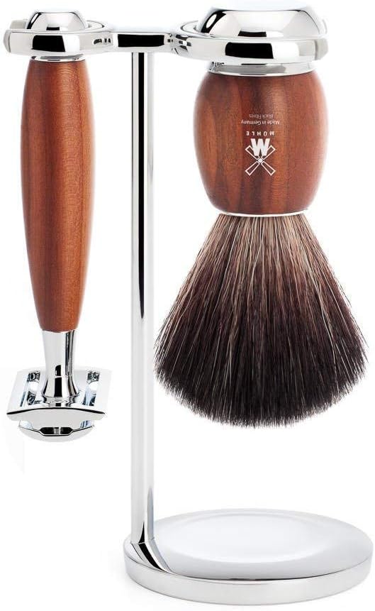 MÜHLE Vivo Rasierset - Black Fibre-Rasierpinsel, Rasierhobel, Ständer - Griffe aus Pflaumenholz und