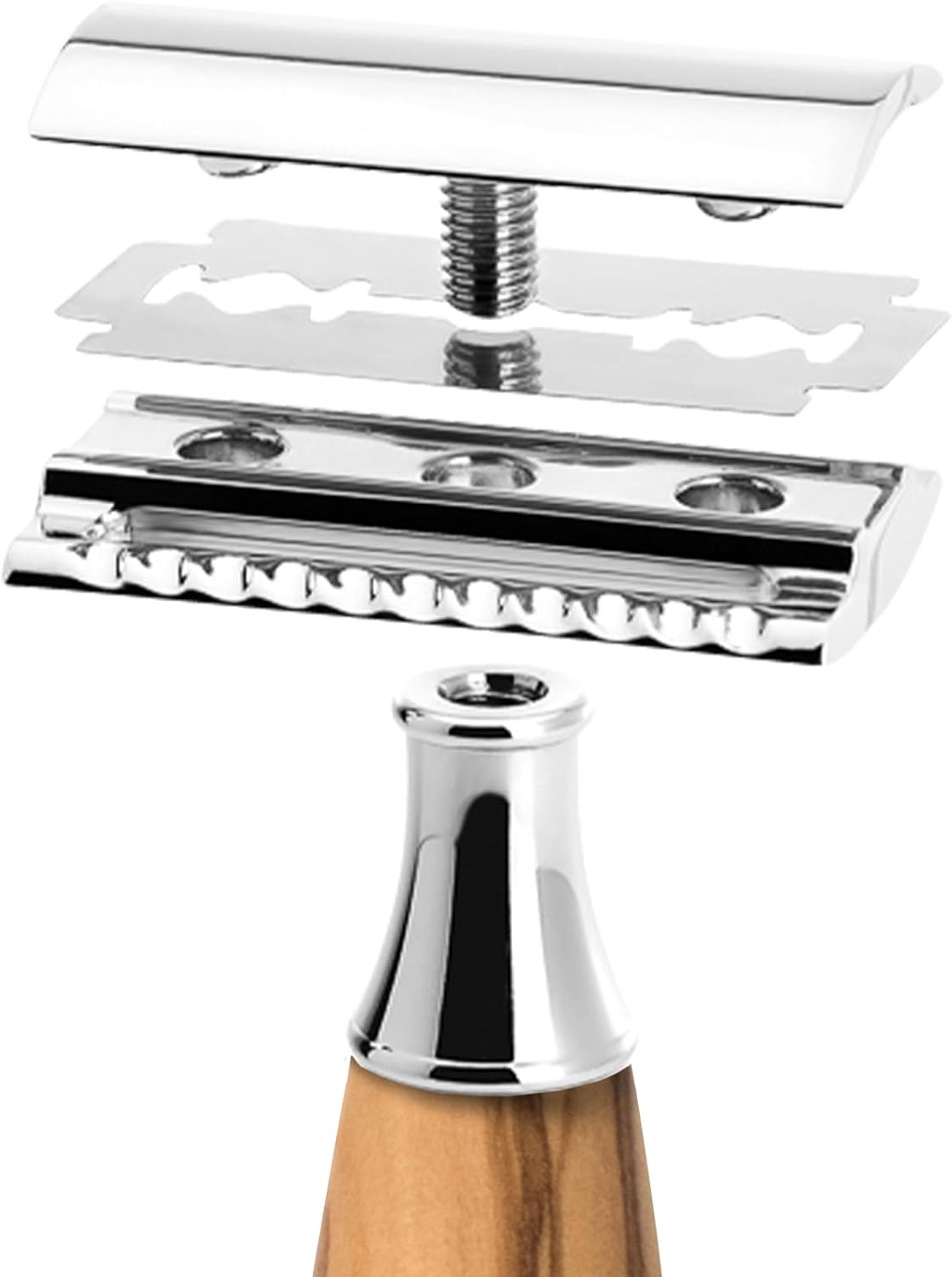 - All-in-One - Alles für die perfekte Rasur: Rasierpinsel mit Black Fibre, Rasierhobel mit geschlossenem Kamm, verchromtem Halter mit Schale - Griffe aus Olivenholz mit verchromten Metallakzenten