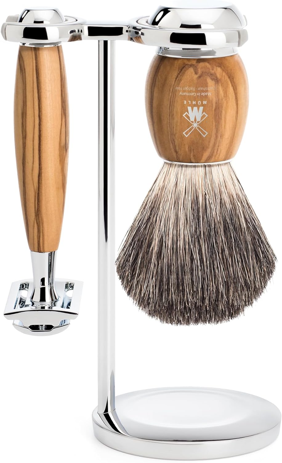 - All-in-One - Alles für die perfekte Rasur: Rasierpinsel aus reinem Dachshaar, Rasierhobel und verchromtem Halter - Griffe aus hellbraunem Olivenholz mit verchromten Metallakzenten
