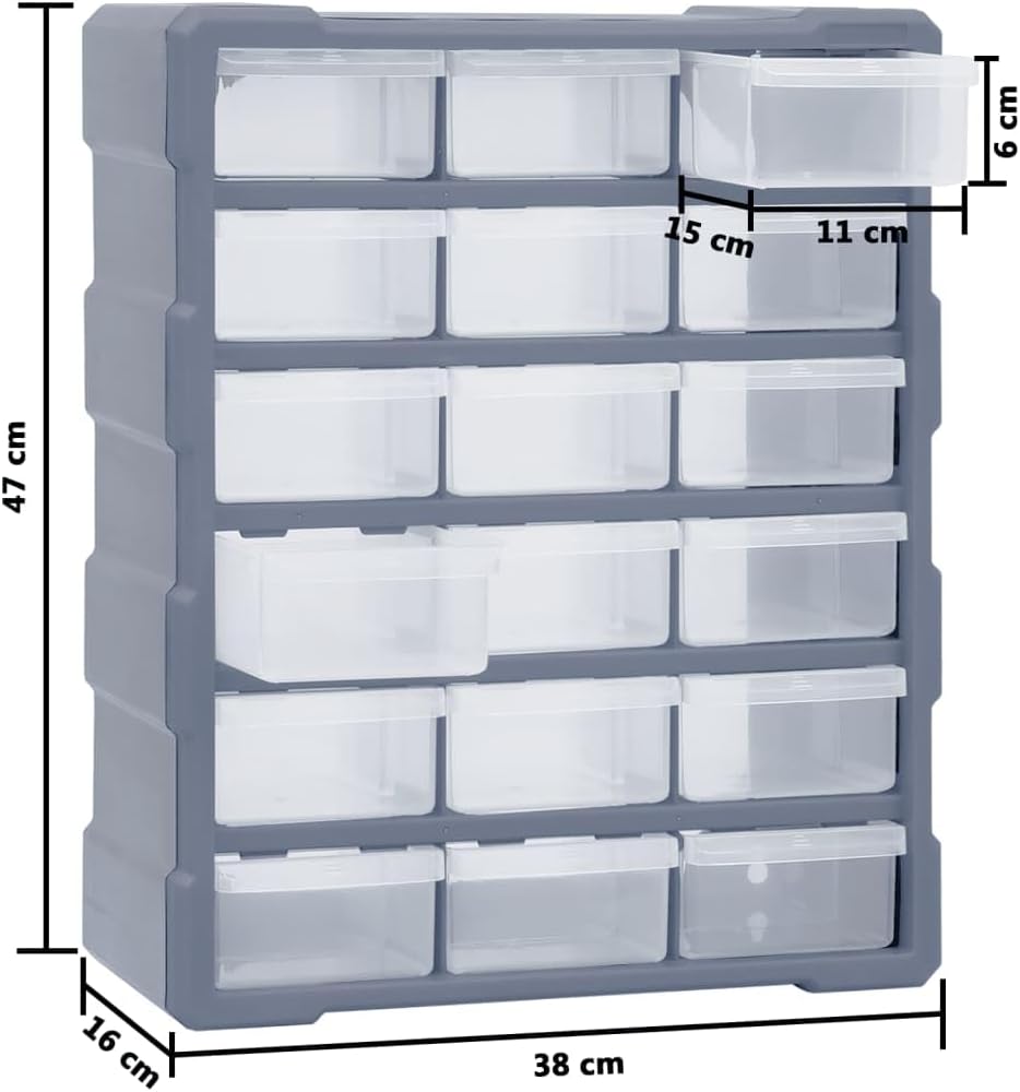 - Dieser Multi-Schubladen-Organizer mit insgesamt 18 Schubladen ist für die übersichtliche Aufbewahrung einer Vielzahl von Gegenständen konzipiert.