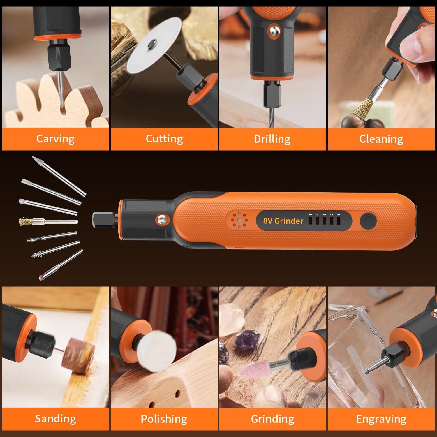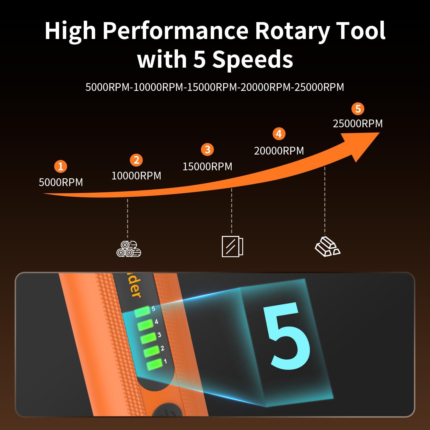- 5 Variable Geschwindigkeiten: Mit 5 Geschwindigkeitseinstellungen von 5000 bis 25000 U/min eignet sich dieses vielseitige multifunktionswerkzeug für verschiedene aufgaben wie schneiden, bohren, schnitzen und polieren. Kabellos und tragbar bietet es