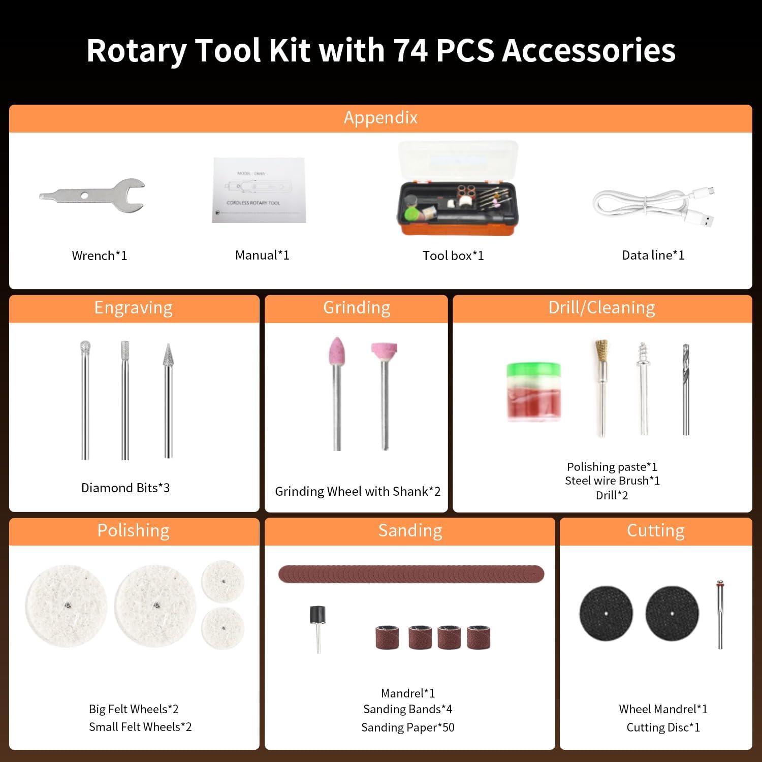 - Vielseitiges 74-teiliges Zubehörset: Verfügt über ein 74-teiliges zubehörset für verschiedene aufgaben wie gravieren, schneiden, bohren und polieren. Kompatibel mit anderen marken, eignet es sich für heimwerkerprojekte wie das schleifen von