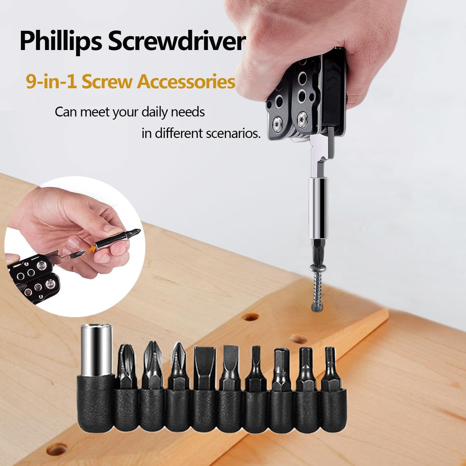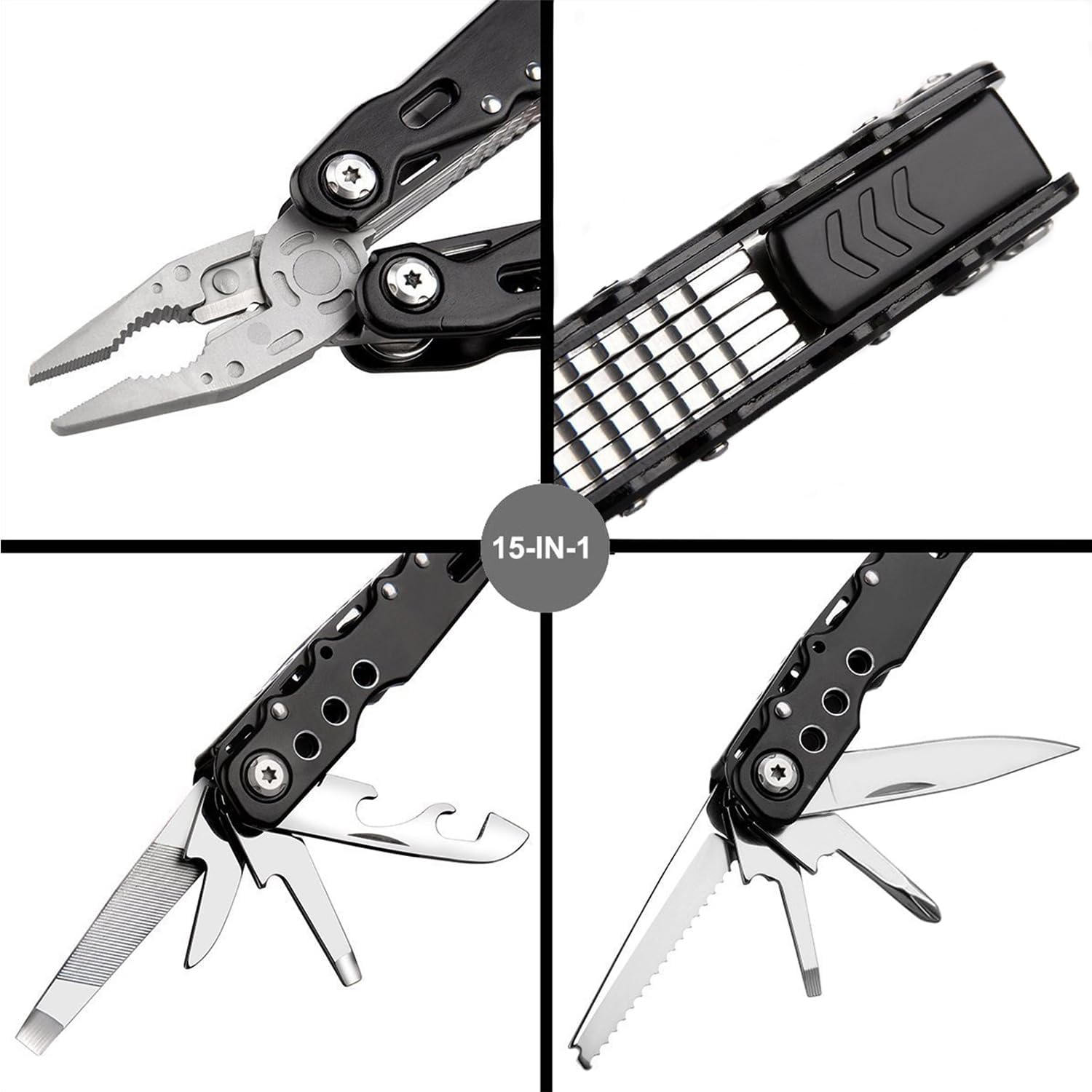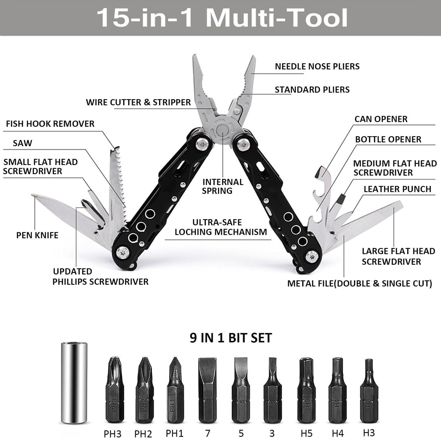 • 【15 in 1 Multizange & 9 in 1 Bit Sets】Gefederte Zange, Spitzzange, Drahtschneider, Messer, Grösser Schlitzschraubendreher, Mittler Schlitzschraubendreher, Kleiner Schlitzschraubendreher, Nagelfeile, Kleines Messer, Philips Schraubendreher,