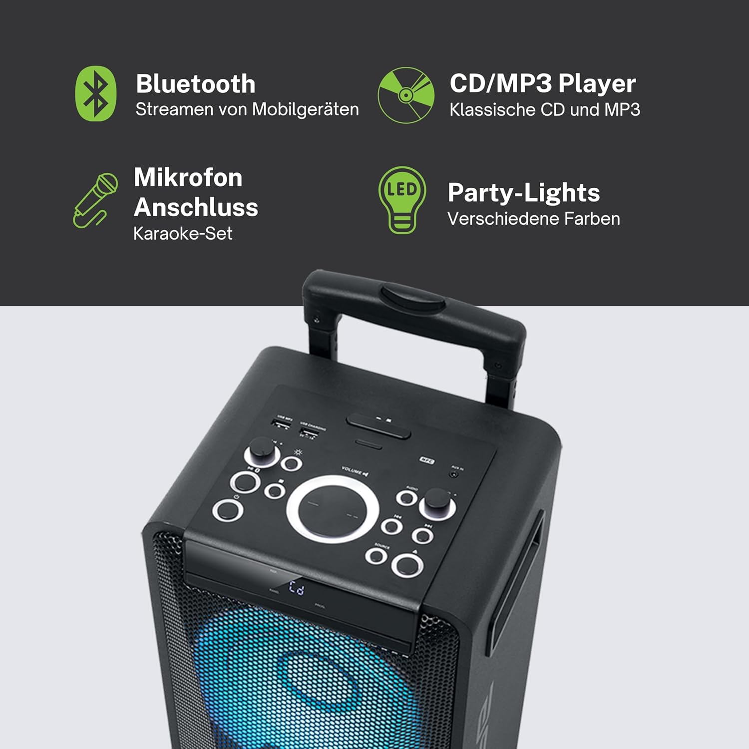 • CD und MP3: Eingebauter CD-Player spielt CD, CD-R/RW und auch MP3-CDs ab. Leicht zu transportieren durch Trolley-Bauweise.