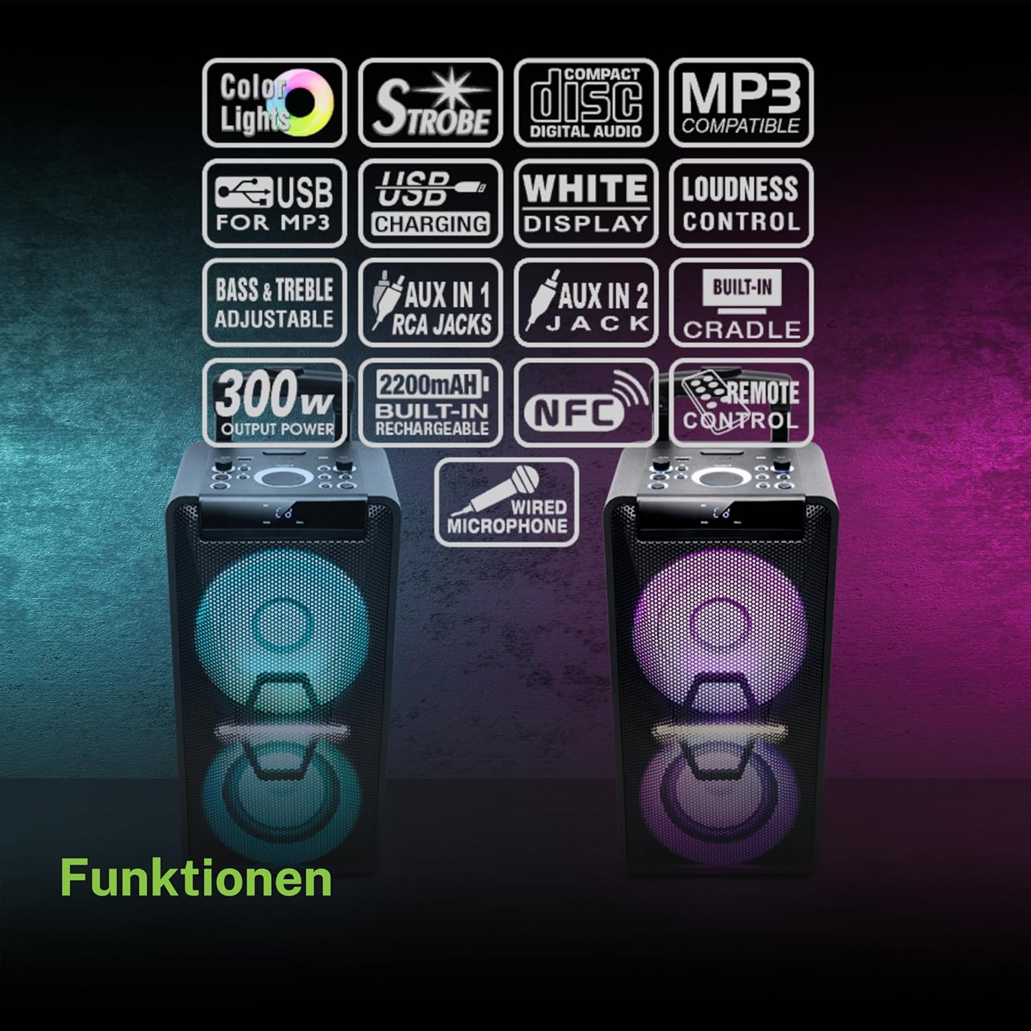 • Soundbox: leistungsstarkes PA-System mit 300 Watt Musikleistung für Party, Musiker, DJ, Präsentationen oder Karaoke. Flexibel durch Akku-Betrieb (Lithium-Ionen).