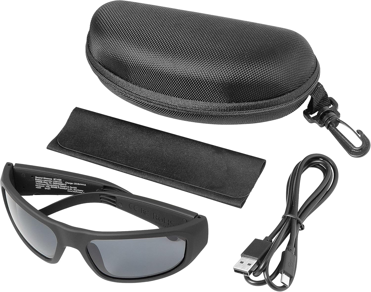 - Sound & Sport Design – Die BT-X59 Sonnenbrille hat schwarze polarisierte Gläser, ein sportliches modernes Design und zudem kann man mir ihr Musik hören und telefonieren ohne Stöpsel im Ohr