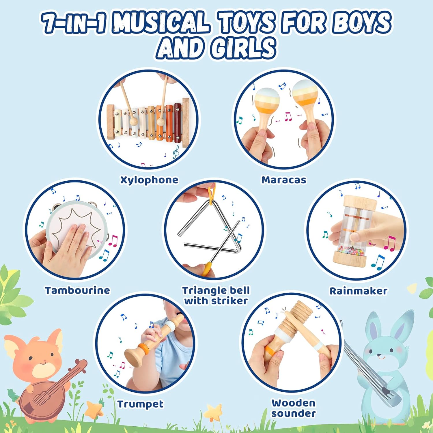 - Musikinstrumente 7 in 1: Dieses wunderbare montessori spielzeug für Kinder enthält 1 Xylofon, 1 Tamburin, 1 Triangel mit Schlägeln, 1 Holzklangmaker, 2 Maracas, 1 Regenmacher und 1 Trompete – alles, was junge Musiker brauchen, um die Welt der Musik