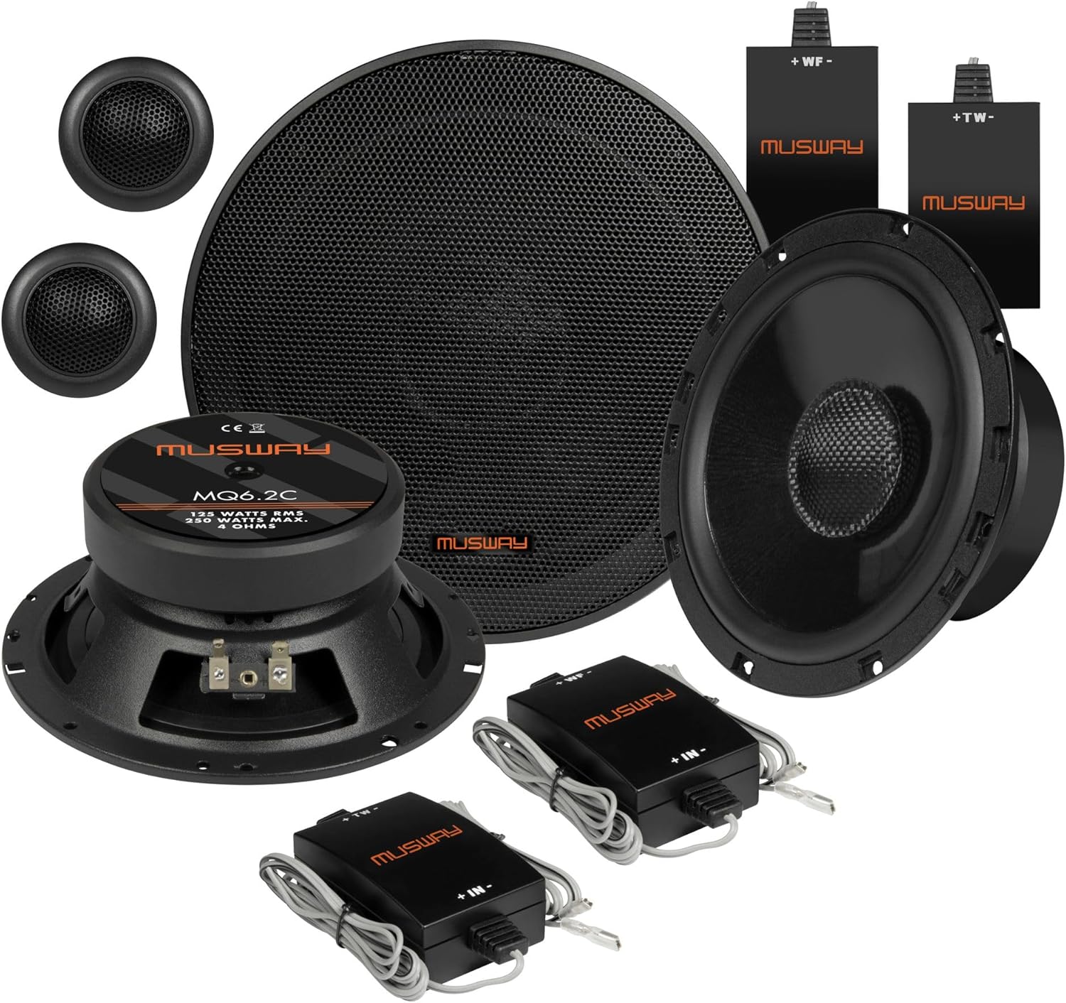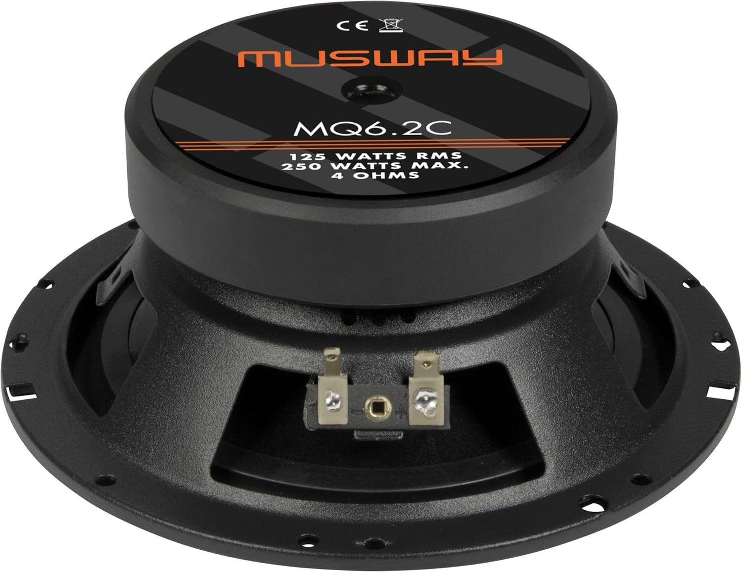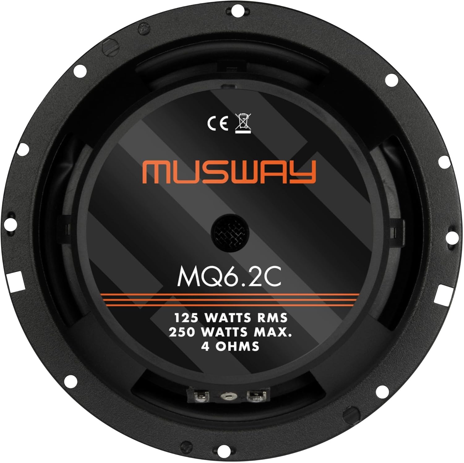 PRODUKTBESCHREIBUNGEN Musway MQ6.2C - 16cm Lautsprecher System Die MQ Lautsprecher sind die Top-Modelle im MUSWAY Speaker-Programm. Sie zeichnen sich durch präzise Klangwiedergabe, hohen Wirkungsgrad und hohe Belastbarkeit aus. Dies wird durch sehr grosse 16,6 Unzen Magnetantriebe in Verbindung mit 30 mm Schwingspulen (bei allen 16,5 cm Modellen) erreicht. Membranen aus Polypropylen mit Grafit-Verstärkung und Glasfiber-Staubschutzkalotten setzen die so erzeugte Kraft souverän um. Sie besitzen die nötige Stabilität, um den kräftigen Antrieb in lineare, verzerrungsfreie Musiksignale umzusetzen. Damit der Hochtonbereich ebenfalls klar und sauber abgebildet wird, setzen die Entwickler fein abgestimmte 25 mm Gewebe-Neodymkalotten ein. Komplettiert werden die Sets mit den kompakten Inline-Weichen, die im Bass- und Hochton-Zweig getrennt und daher einfach zu installieren sind. Die drei Koaxial-Modelle der MQ Serie sind ebenfalls mit der neuartigen Verbundmembran aus Polypropylen mit Grafit-Verstärkung ausgestattet. Auch sie besitzen extrem kräftige Antriebe mit grossen Schwingspulen, welche hohe Belastbarkeiten ermöglichen. Den hohen Wirkungsgrad der Bässe und den linearen Frequenzgang setzen die 20 mm Seidenkalotten-Hochtöner bis weit über 20 kHz fort. Auch auf Einbaufreundlichkeit wurde geachtet: So stehen die Hochtöner vorne am Lautsprecher kaum über. Alle Modelle werden, genau wie die Komponenten-Systeme, mit einem hochwertigen Schutzgitter ausgeliefert. MQ6.2C 16,5 CM (6.5') 2-WEGE KOMPONENTEN-SYSTEM 125 Watt/RMS, 250 Watt/MAXFrequenzbereich 55 - 22000 HzImpedanz 4 Ohm30 mm SchwingspulePolypropylen-Graphit-MembranenSeparate Frequenzweichen für Hochtöner und Bass25 mm Gewebe-Neodym-HochtönerSchutzgitterEinbautiefe 63 mmEinbauöffnung 144 mm