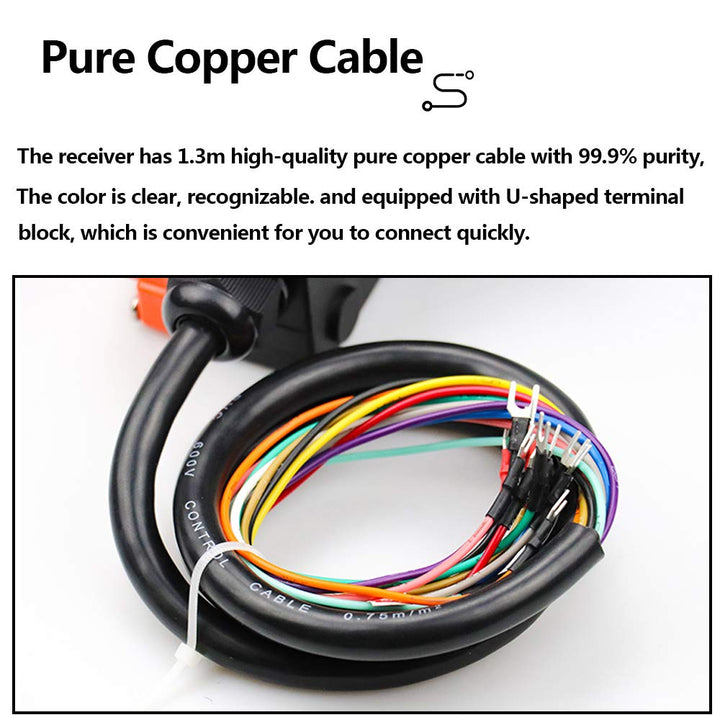 - [REINES KUPFERKABEL] Die Fernbedienung mit Batterie ist mit 2 AA-Batterien ausgestattet. Der Empfänger wird mit 1,3 m hochwertigem reinem Kupferkabel geliefert, die Farbe ist hell und klar und er ist mit U-förmigen Klemmenblöcken für eine einfache