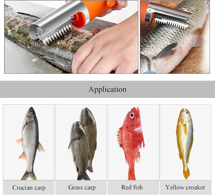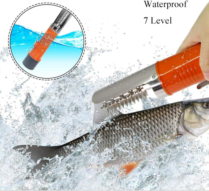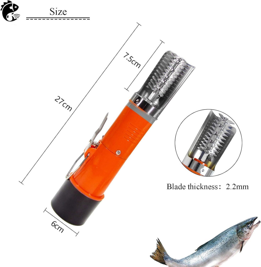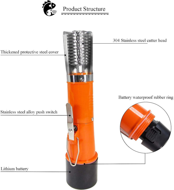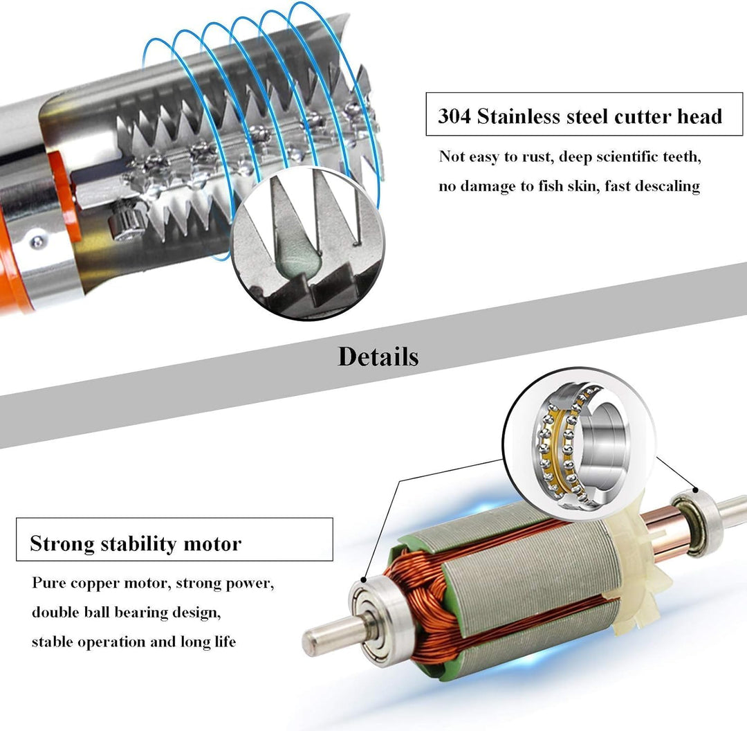 - [AUSGEZEICHNETES MATERIAL] Der elektrischer Fischschupper verwendet einen Edelstahl-Schneidkopf, um die Fischschuppen schnell abzuschaben, ohne die Fischkörperstruktur zu beschädigen. Es gibt eine Schutzhülle aus Edelstahl 304, die das Spritzen von
