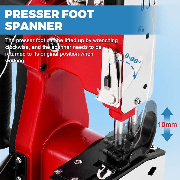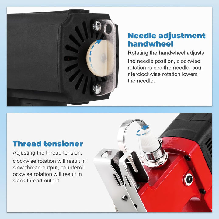- [EINSTELLBARE STICHLÄNGE] Die Stichlänge kann zwischen 7 und 10 mm eingestellt werden, die Nähdicke beträgt ca. 8 mm und die Pressdicke beträgt ca. 4 mm. Je nach Material kann die Gewindepresse entsprechend eingestellt werden, um einen guten