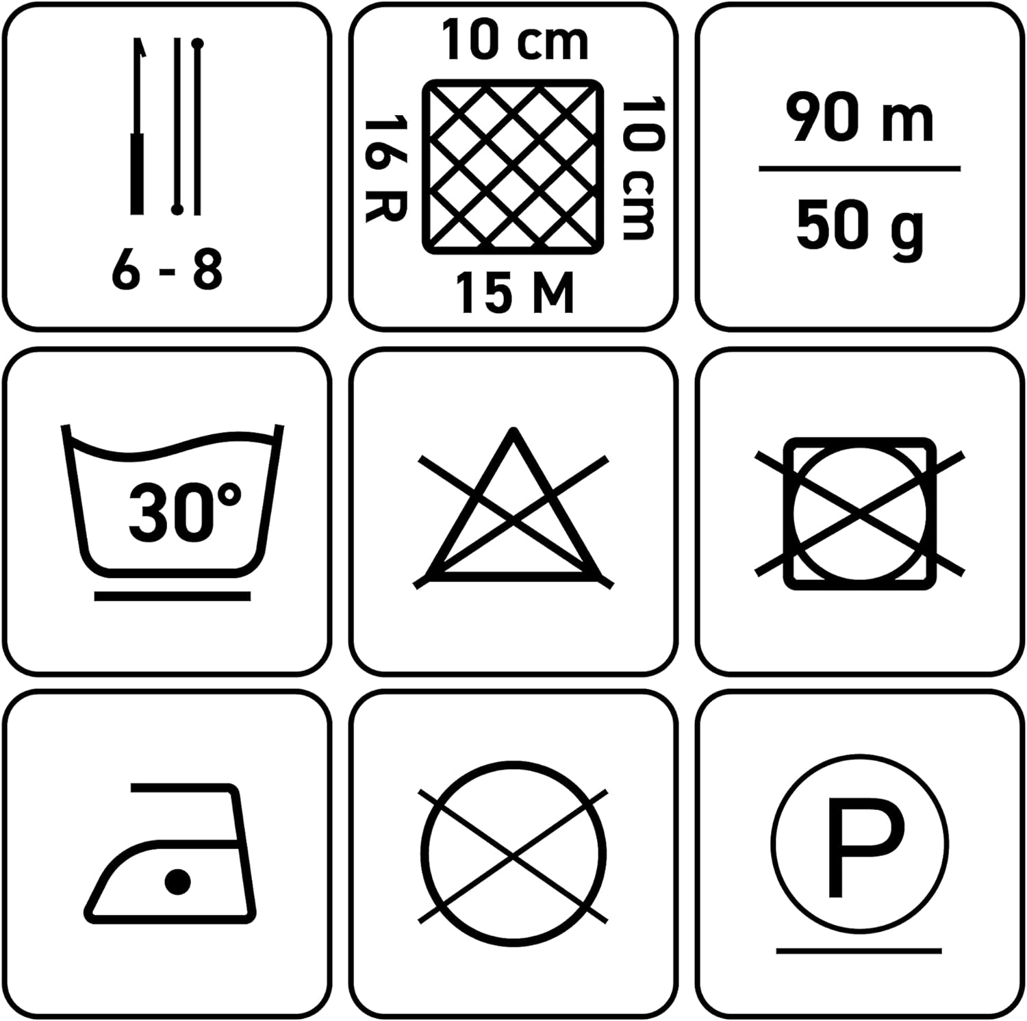 • Basics: Das Wollknäuel besitzt eine Länge von 90m auf 50g und ist bis zu 30 Grad waschbar. Es wird zur Verarbeitung die Nadelstärke 6 – 8mm empfohlen.