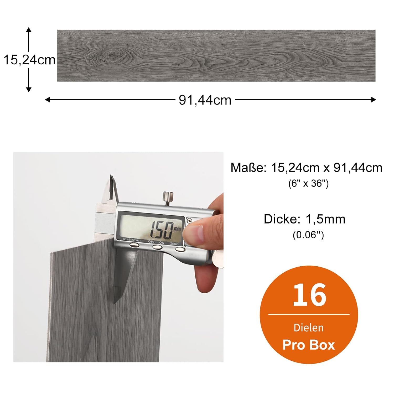 - Spezifikation: Jede Vinylplanke misst 15,24 cm x 91,44 cm und ist 1,5 mm dick. Jede Box enthält 16 Planken, die eine Fläche von 2,23 m²