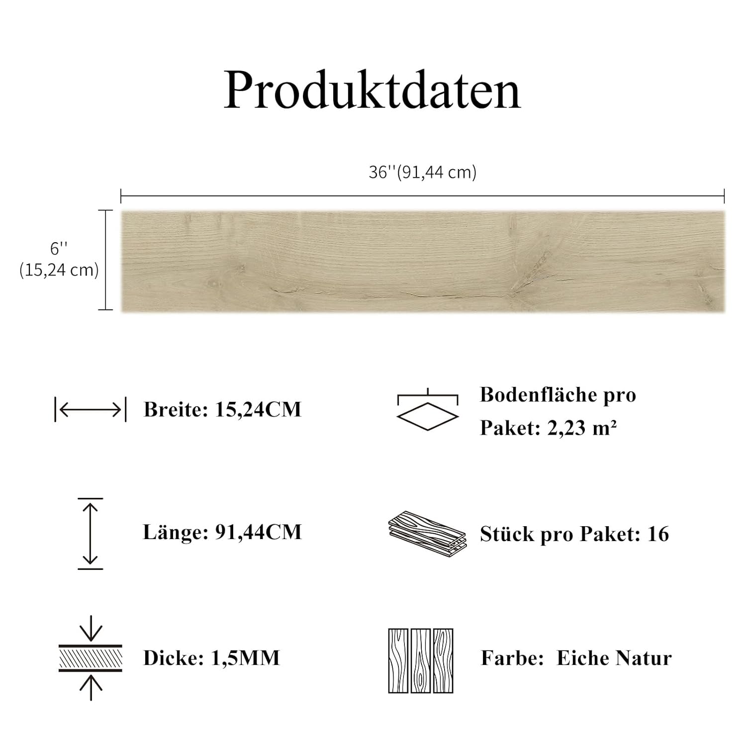 - Spezifikation: Jede Vinylplanke misst 15,24 cm x 91,44 cm und ist 1,5 mm dick. Jede Box enthält 16 Planken, die eine Fläche von 2,23 m²