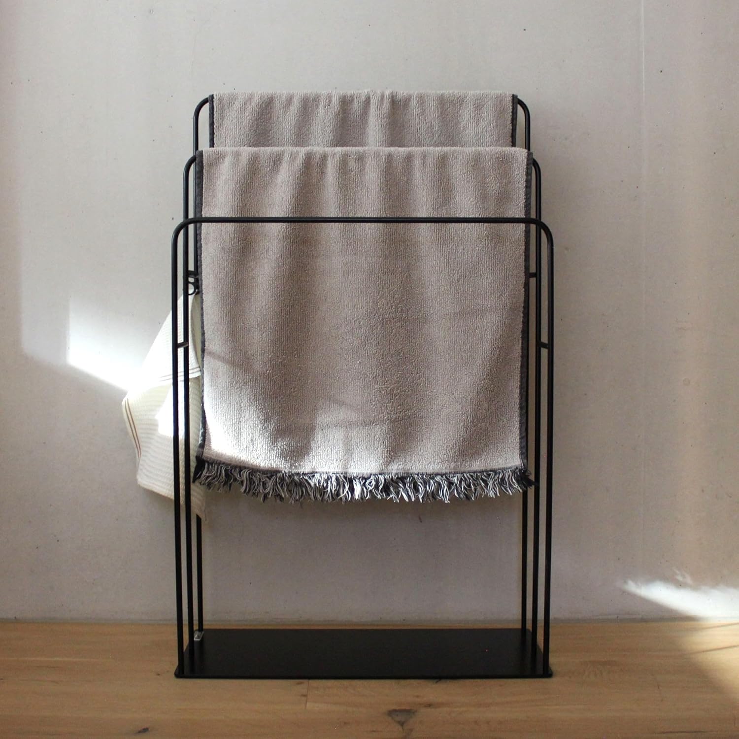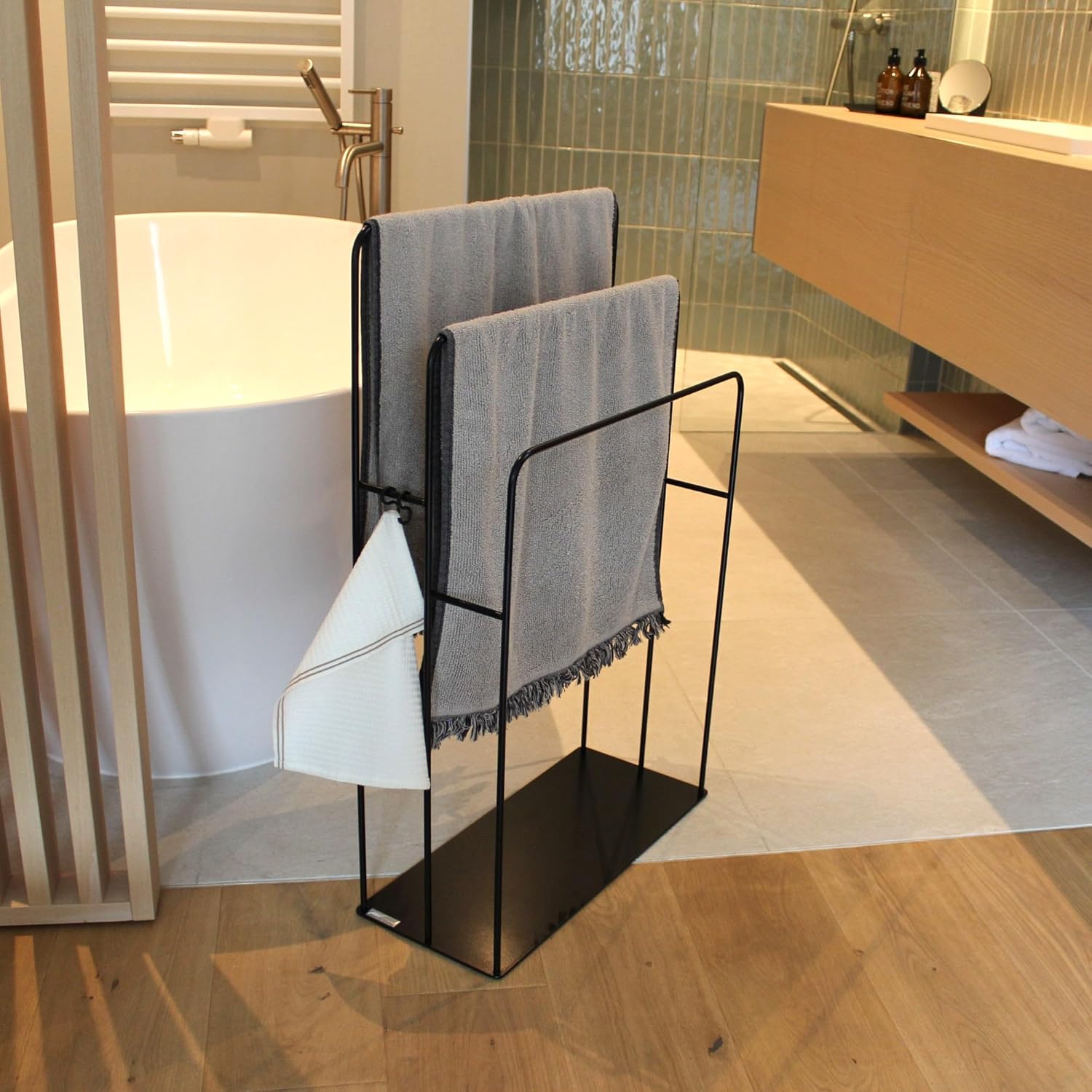 - ✨ Praktische Handhabung: Der freistehende Handtuchhalter wird fertig montiert geliefert und ermöglicht das gleichzeitige Trocknen mehrerer Handtücher, dank seiner drei Stangen und zwei zusätzlichen Haken.
