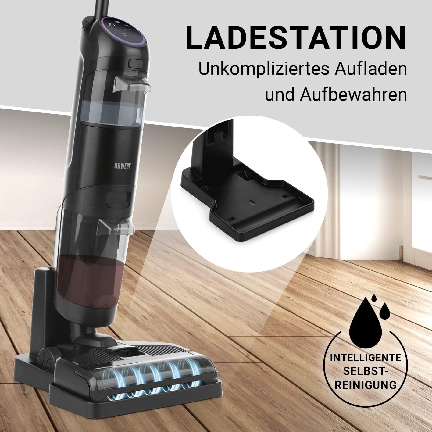 - Praktisches LED-Display: Auf dem Display des elektrischen Bodenwischers werden alle Informationen wie Akku-Ladestand, Selbstreinigung, Feuchtigkeit, Rollenblockierungen und der jeweilige Modus u.v.m. angezeigt