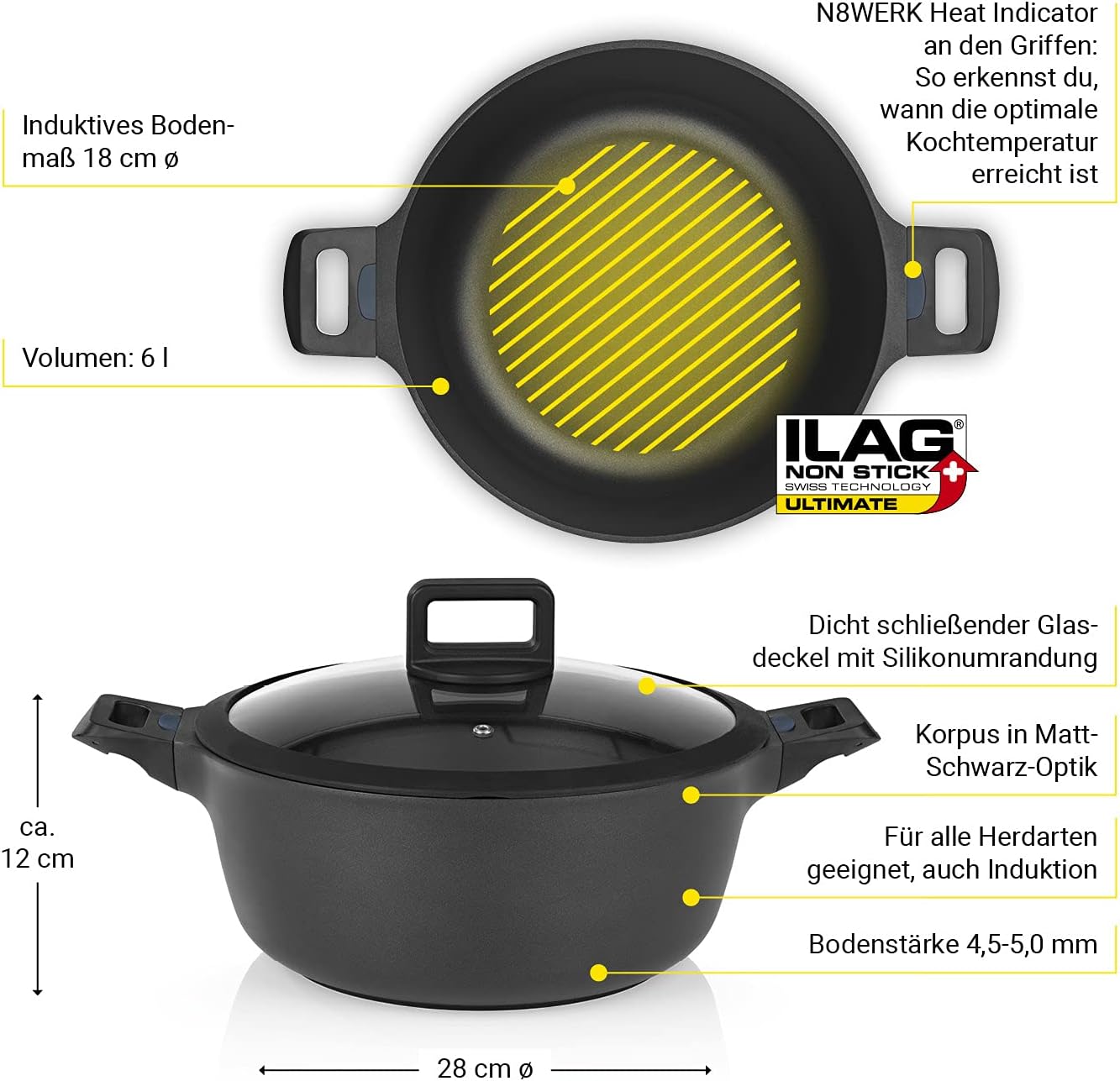 - 3-FACH ILAG ULTIMATE-BESCHICHTUNG - Die Innenbeschichtung des N8WERK Aluguss-Kochtopfs bietet die qualitativ beste Beschichtung für die allerhöchsten Anforderungen in der eigenen Küche. Perfekt für fettarmes Kochen ohne Anbrennen.