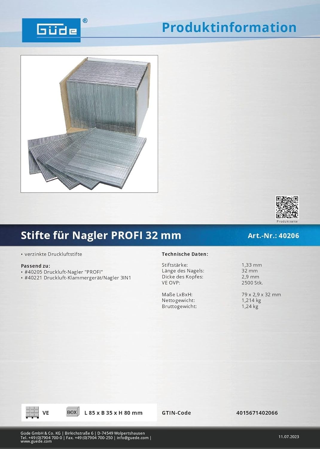 • Die Güde Stifte / Nägel für Druckluft Nagler und Klammergerät sind unverzichtbare Begleiter für professionelle Projekte. Mit einer Länge von 32 mm und einer Stärke von 1,33 mm bieten sie robuste Befestigungslösungen für unterschiedliche