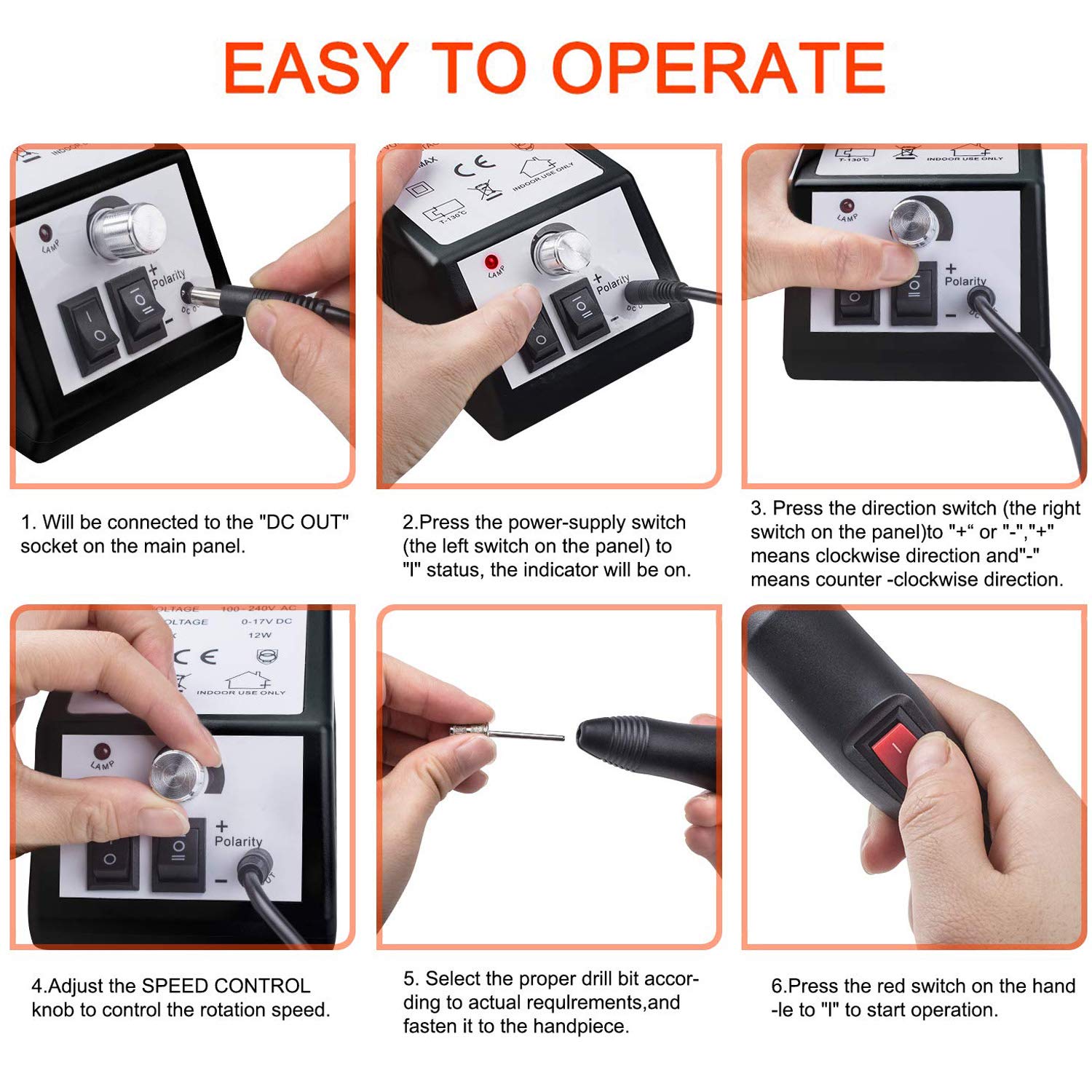- 【Unterschiedliche Geschwindigkeitsanpassungen】Diese Geschwindigkeit der Nagelbohrmaschine kann von 2.000 U / min bis 20.000 U / min eingestellt werden. Geringes Geräusch, geringe Vibration und einstellbare hohe Geschwindigkeit für einen