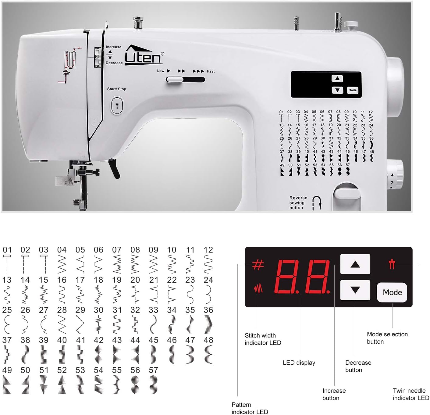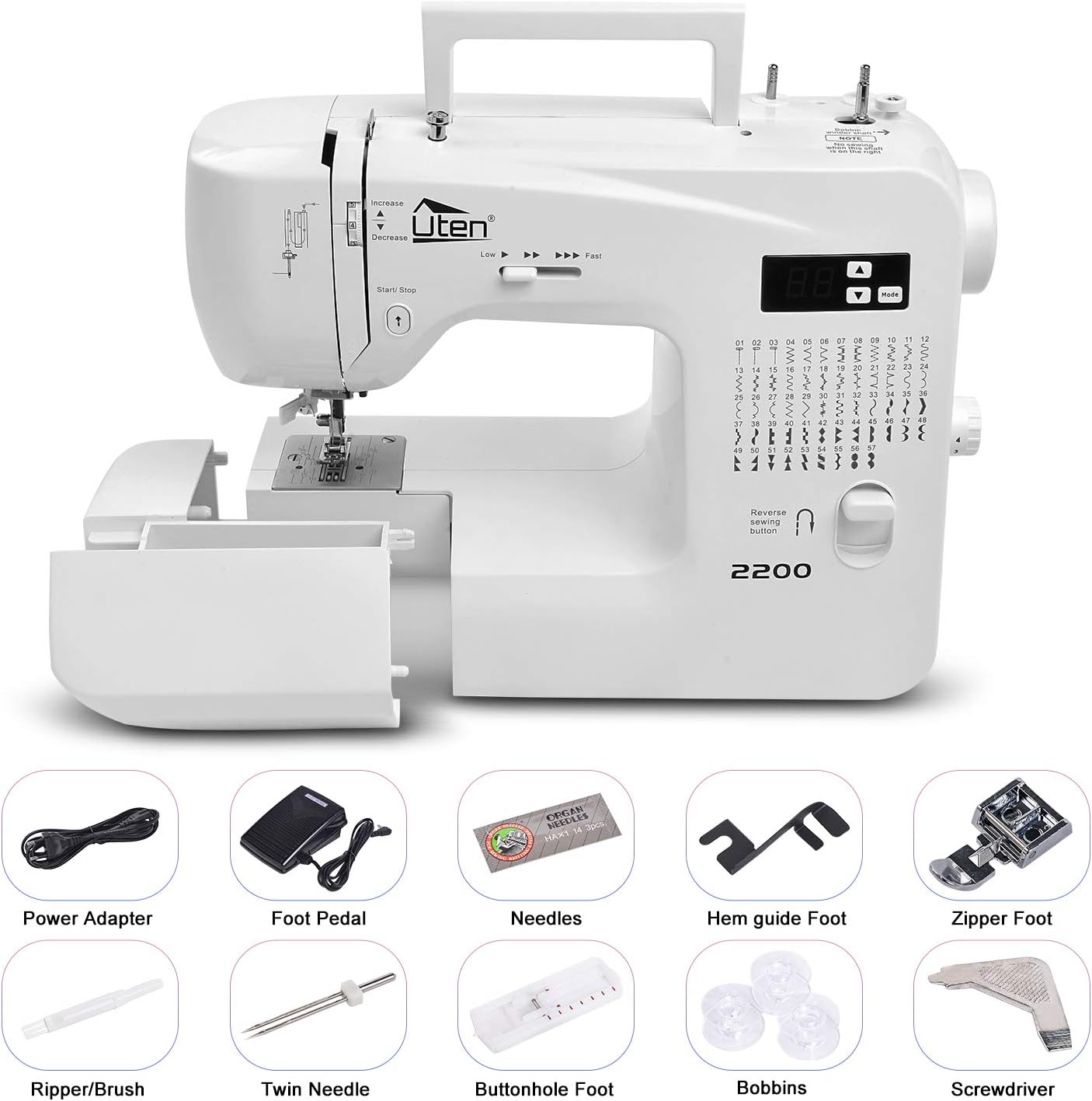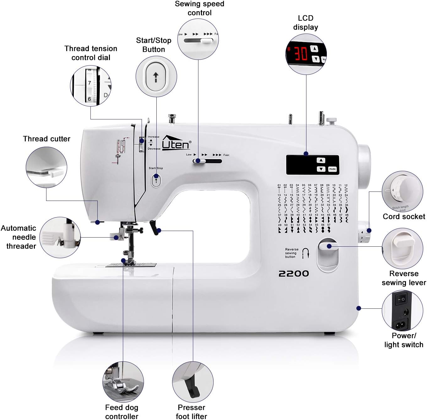 - Nähmaschine Elektrisch: Uten 2200 Computer Nähmaschine besteht aus robuster Aussengehäuse und starke Halterung. Das integriertes LED-Licht leuchtet den grosser Nähbereich perfekt aus. MIt LCD Display kann Sie einfach ausgewählt Stiche und Sichbreite