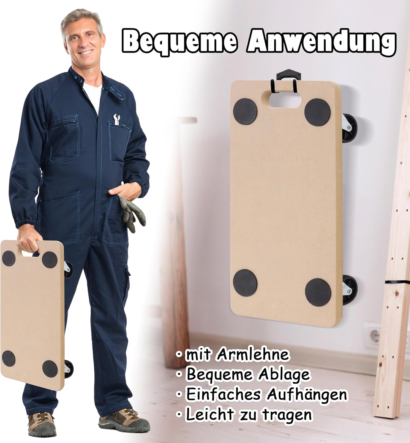 - Bequeme - Am Brett befindet sich ein praktischer Griff, und um Platz zu sparen, kann das Rollbrett nach der Arbeit in der Garage oder im Keller aufgehängt werden.