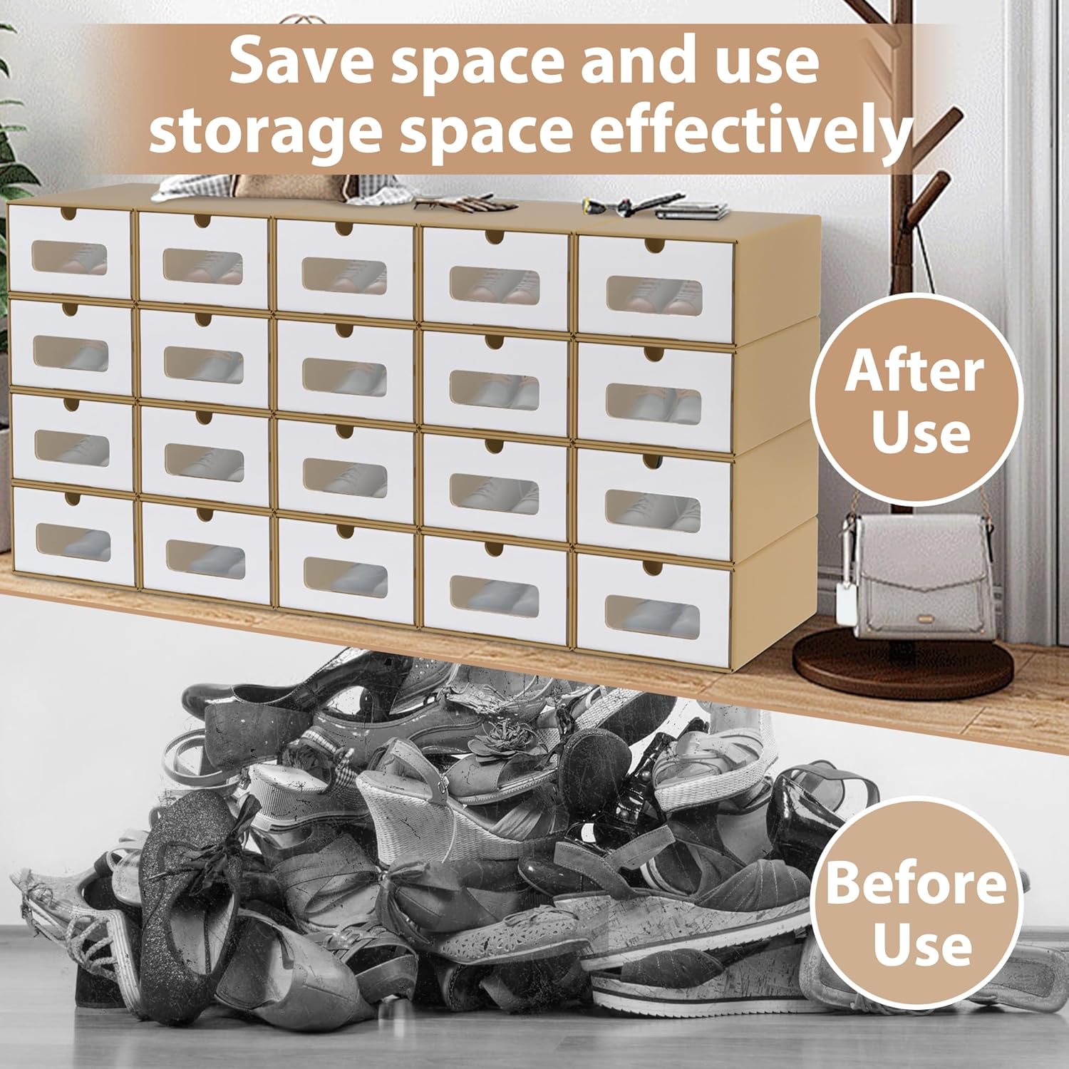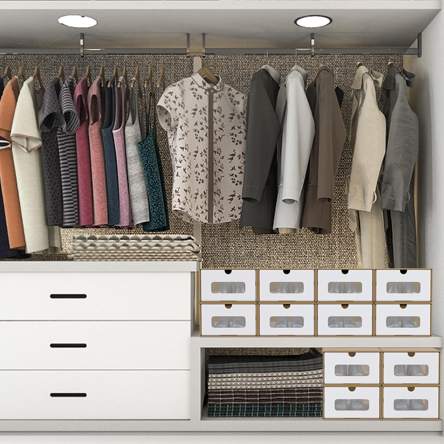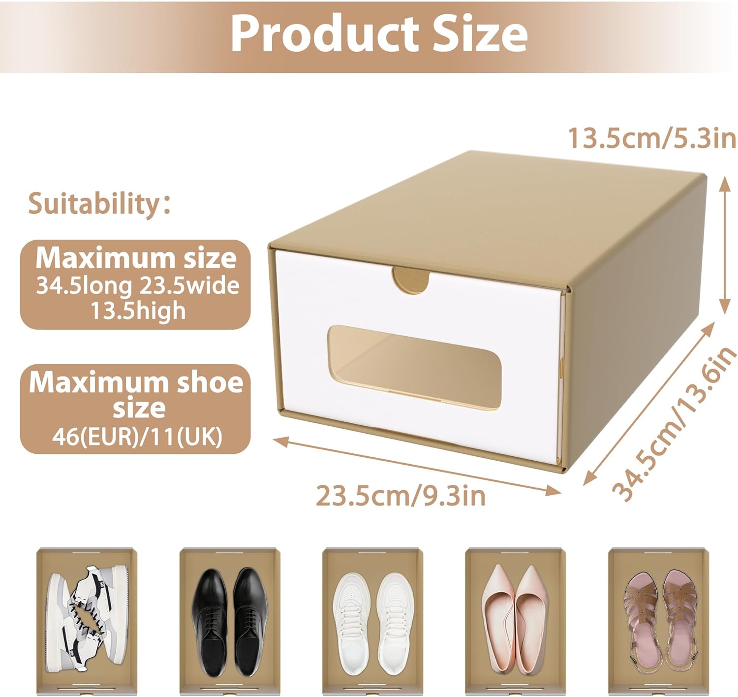 - Starke Tragfähigkeit: Der gehärtete und verdickte Karton sorgt für stabile Lagerung, egal ob Sportschuhe, Lederschuhe oder High Heels – passend für Schuhe bis Grösse 46
