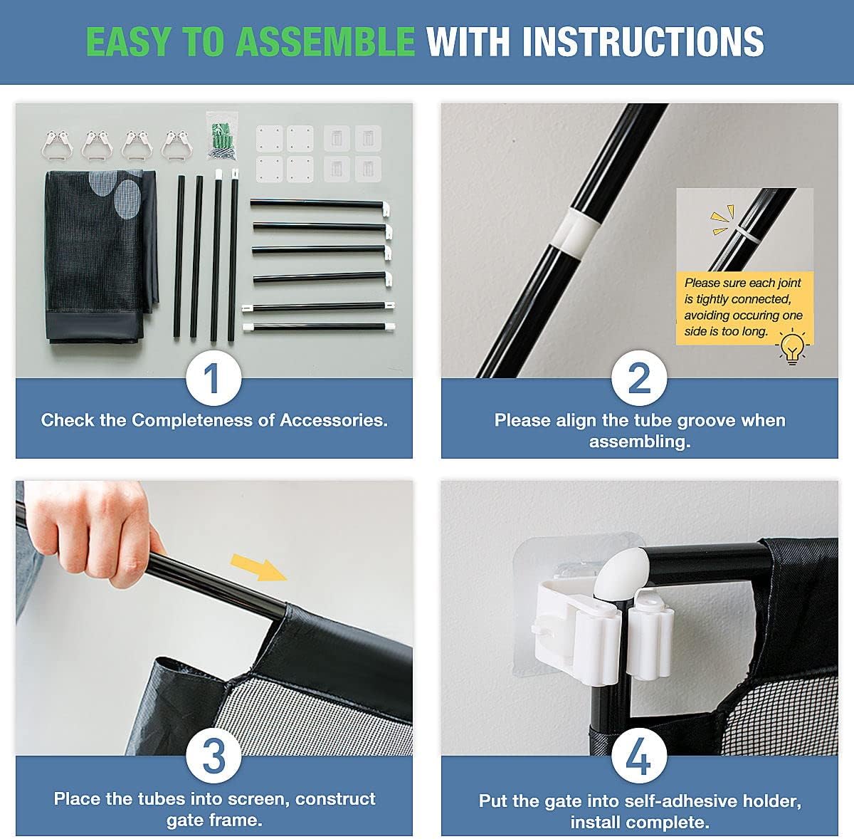 - Einfache Montage: Bringen Sie gemäss der detaillierten Anleitung an, stecken Sie die verbundenen Rohre in die Innenkante des Nylongewebes, um den Türrahmen zu bauen, und verwenden Sie dann die Halterungen, um die Tür an der Wand/dem Türrahmen zu befestigen. Die Hundetür lässt sich leicht abbauen und platzsparend verstauen.
