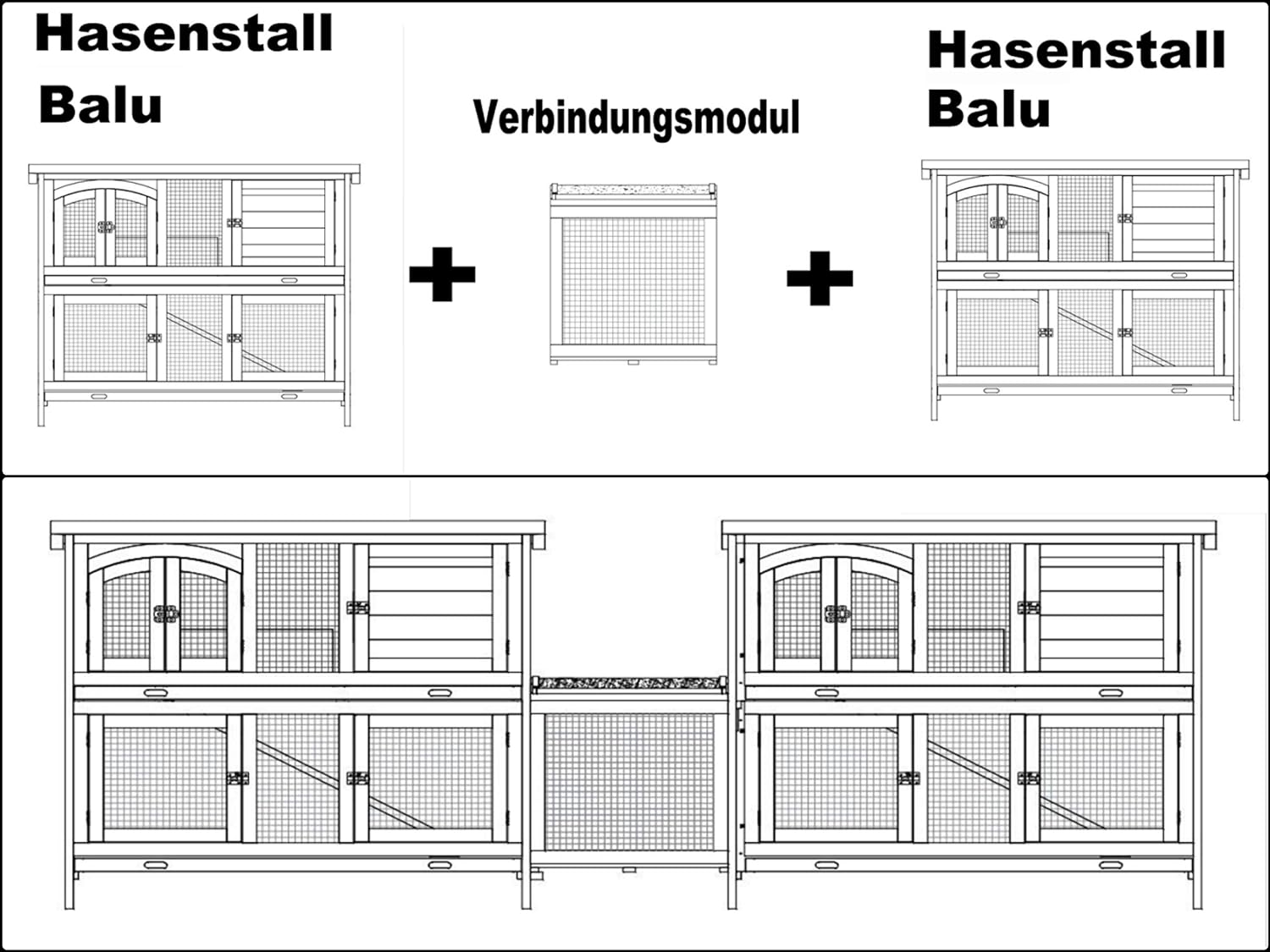 - EINFACHE MONTAGE Beigefügte Querstreben lediglich an vorgestanzten Seitenteile vom Hasenstall Balu schrauben. Anschliessend Verbindungsmodul zwischen beide Ställe schieben und arretieren.