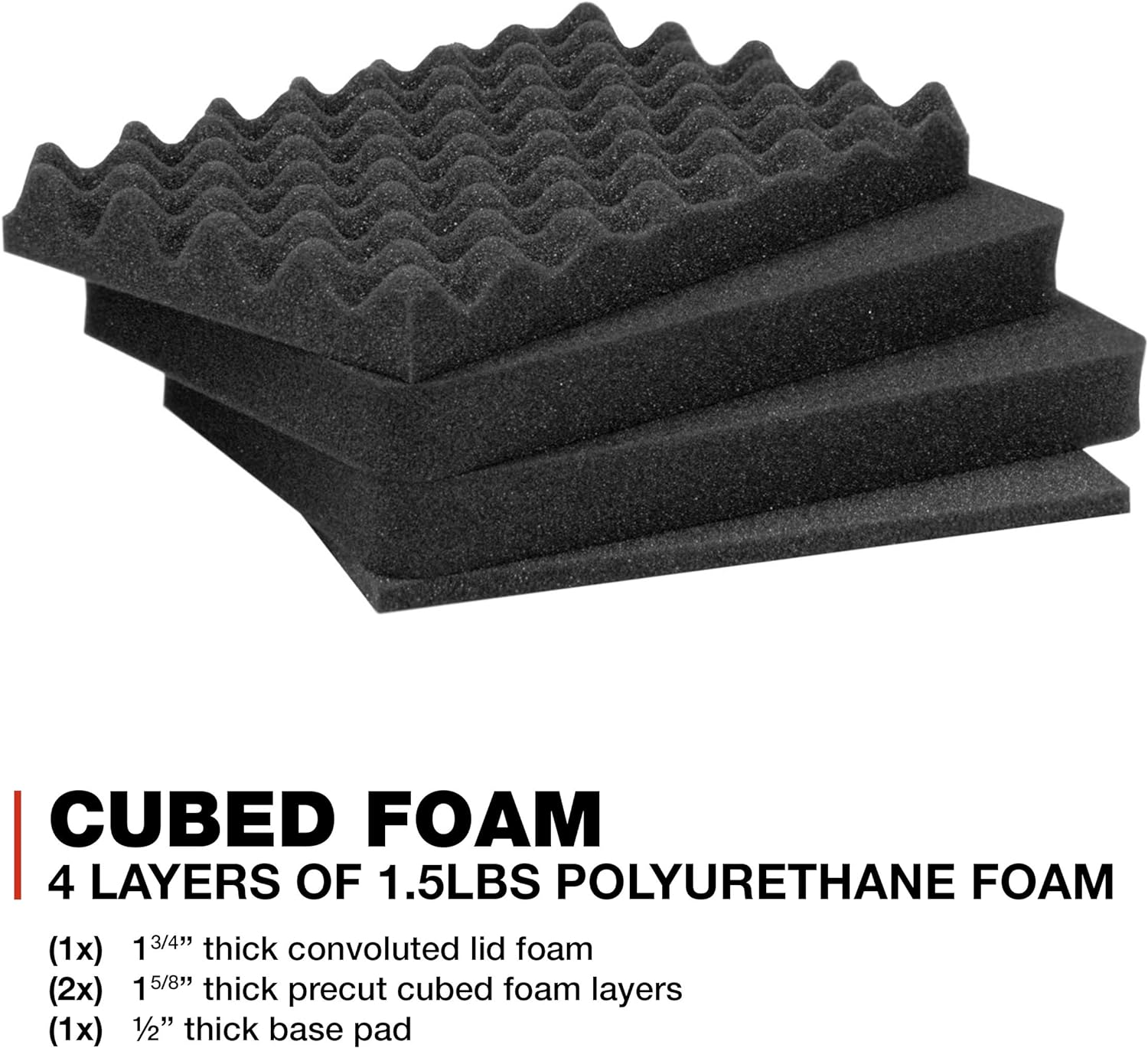 • Der mehrschichtige Satz anpassbarer Einsätze aus hochwertigem Polyurethanschaum enthält eine vorgeritzte, herausnehmbare Schicht. Diese Schicht besteht aus Schaumstoffquadraten, die in verschiedenen Konfigurationen entfernt werden können, um den