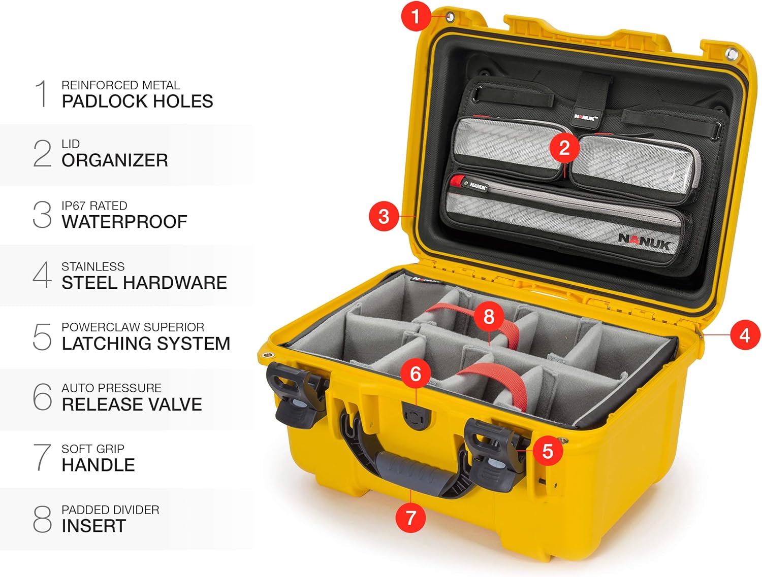 - Neue Kombination - Nanuk Koffer mit gepolsterten Trennwänden und unserem NEUEN Deckelorganizer |Innenmasse (L x B x H): 378 x 249 x 218 mm und Aussenmasse (L x B x H): 429 x 328 x 236 mm