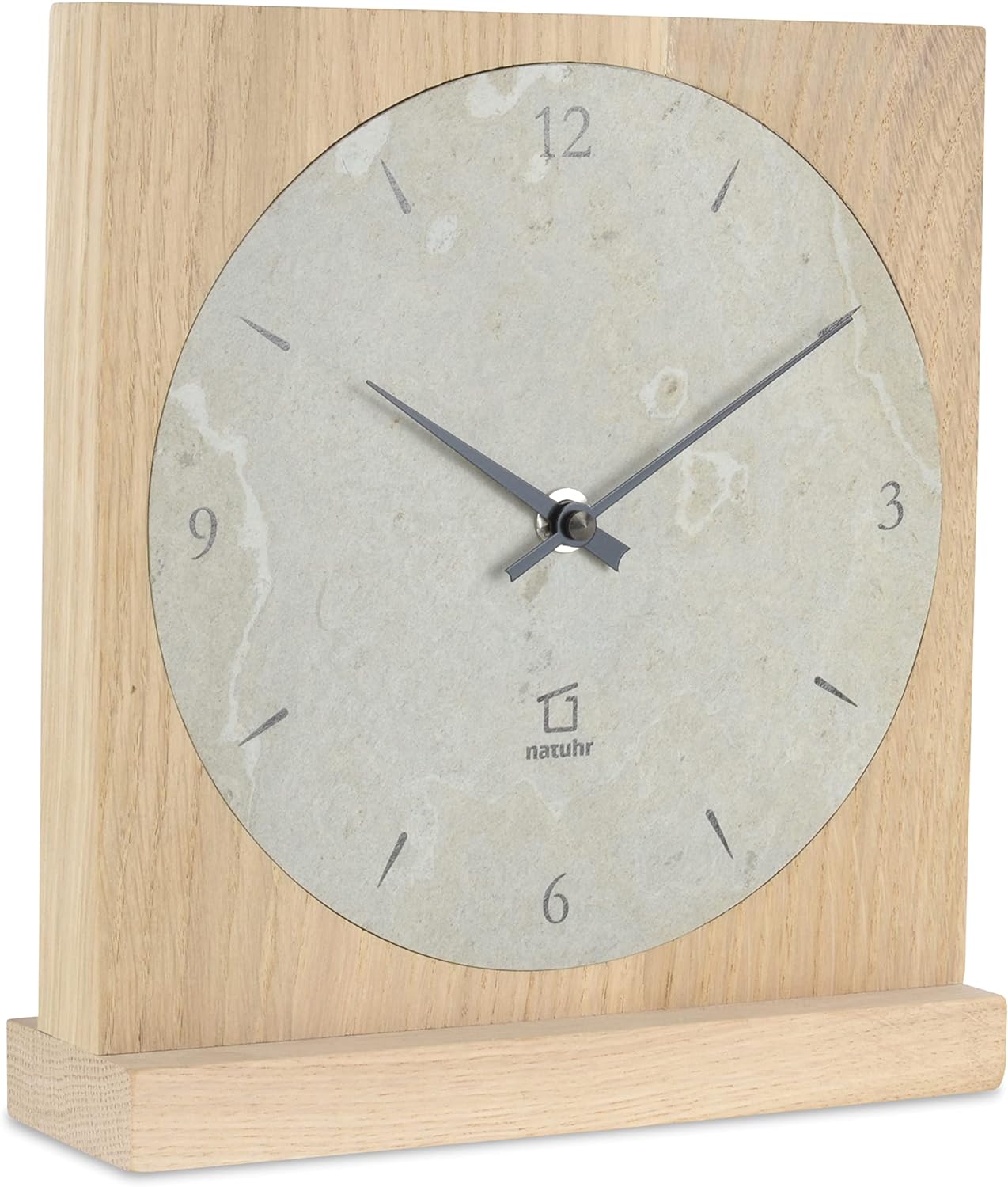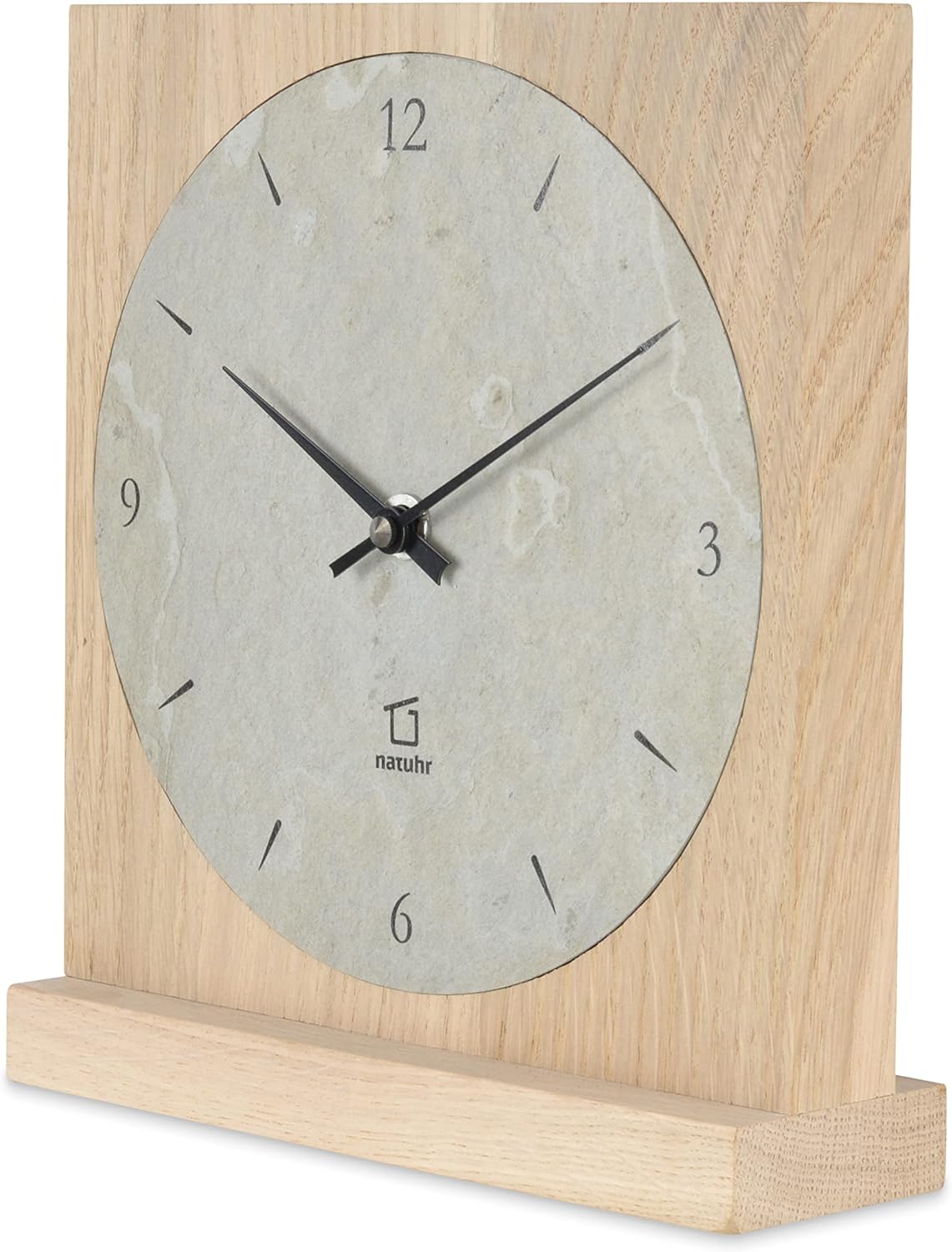 - Edle Design Tischuhr aus massivem unbehandeltem Eichenholz und Grauschiefer kombiniert mit hochwertiger Uhrentechnik aus Deutschland.